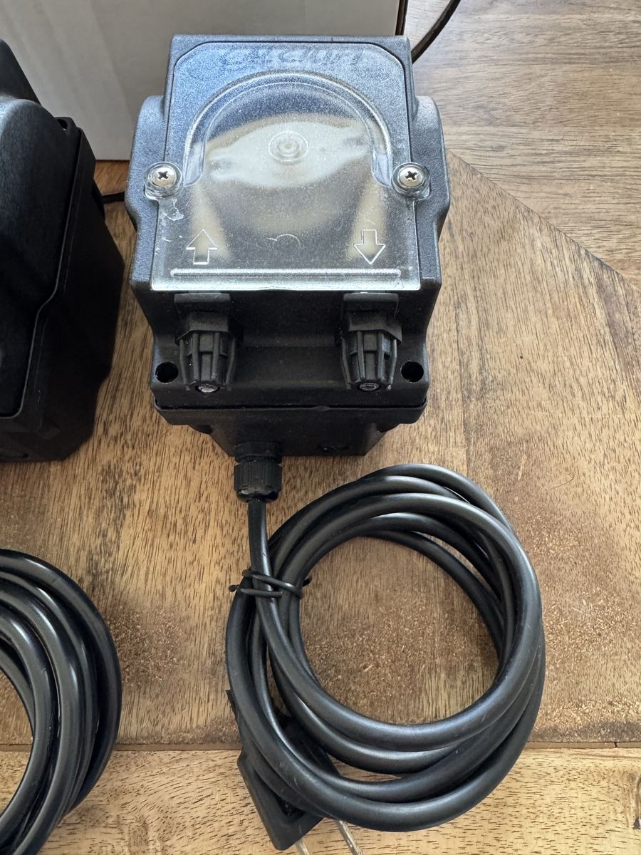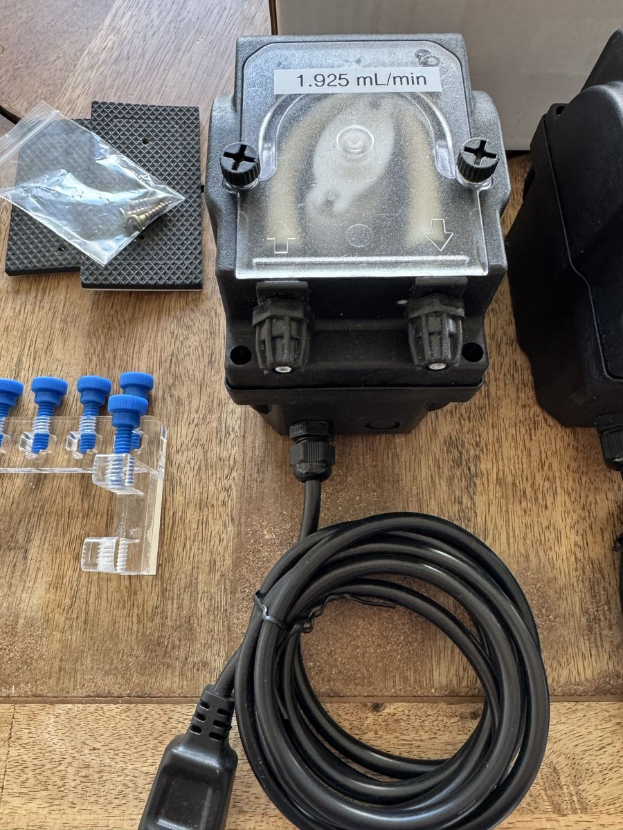 The one with the calibration label on it calibrated high (they’re supposed to be 1.1mL/minute). The other one was close enough to 1.1mL/minute that I don’t feel like I needed to label it differently. Original packaging and tubing (unused) included for the calibrated one. Not for the other. The black rubber pads in the picture I placed behind the mounting plate when mounted inside my wood aquarium stands to reduce vibration as well. I’m throwing in a dosing tube holder that I don’t need either.