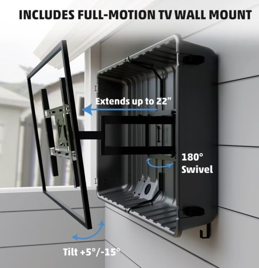 All-weather protection for flat screen TVs up to 65" Includes full-motion, articulating TV wall mount Maximum TV size (L × H × D): 58.25” x 34.5” x 4”