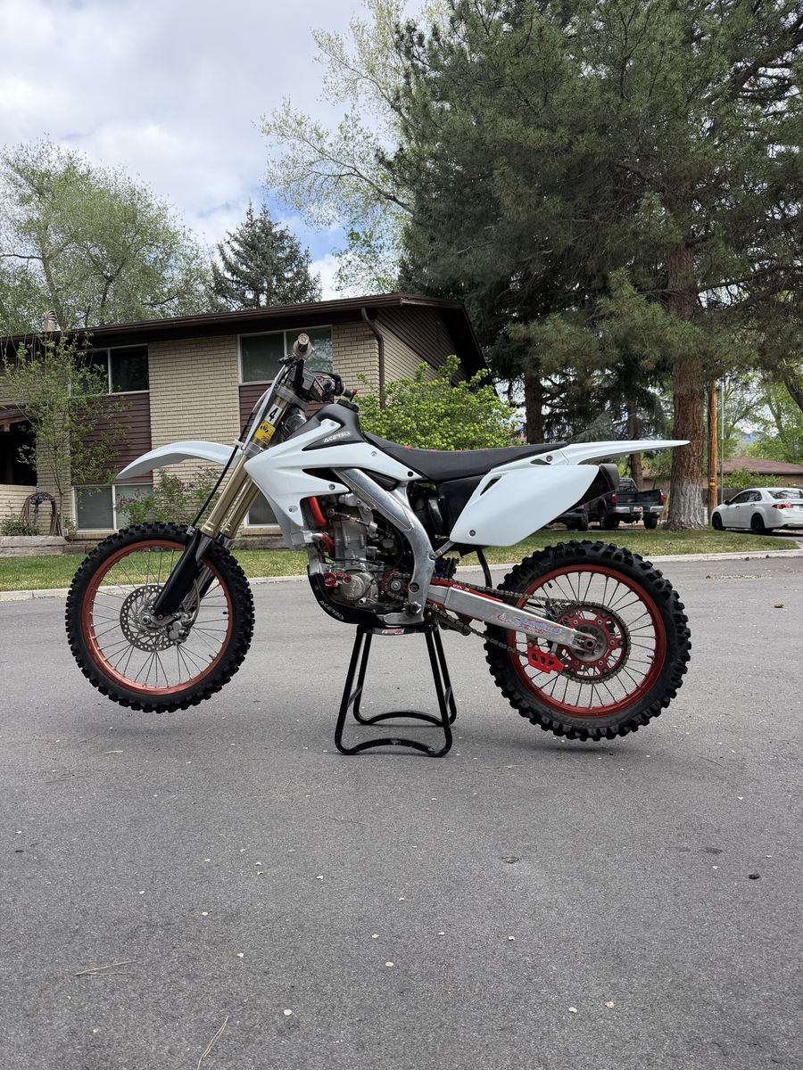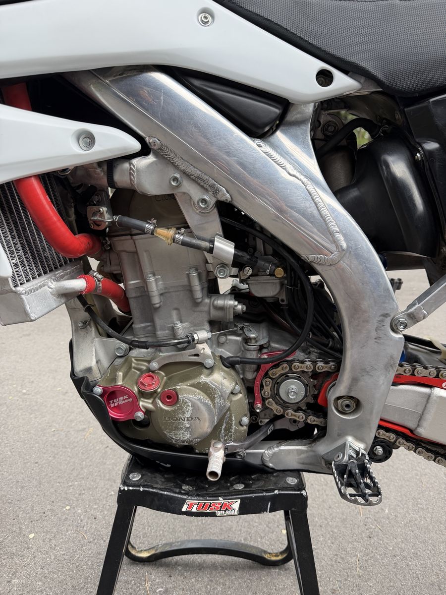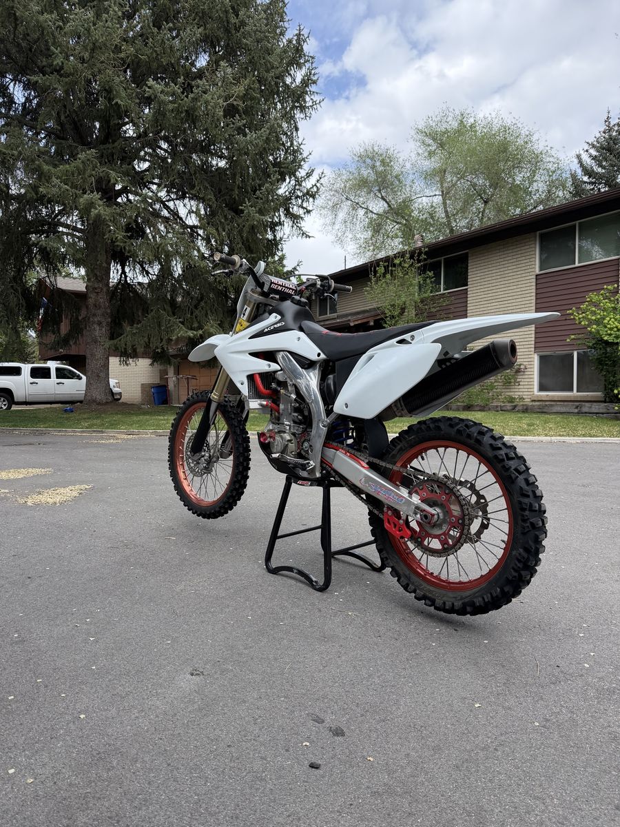 Modifications/upgrades include: Rekluse clutch Z- Start Pro Auto clutch. Race tech suspension set up by Skull Valley 3.2 gallon desert tank (will include stock tank) Oversized radiators with high pressure cap. Brand new Hot Rods water pump shaft, bearing, and gasket. New plastics Moto Seat Renthal bars (will include taller Renthal bars too) Asv clutch and brake levers Odi emig grips Aftermarket exhaust Fork seals and rear shock seal recently replaced Recently had the carb refreshed by Alpine XC Tm design chain guide and slide. Supersprox stealth rear sprocket. Red excel wheels.
