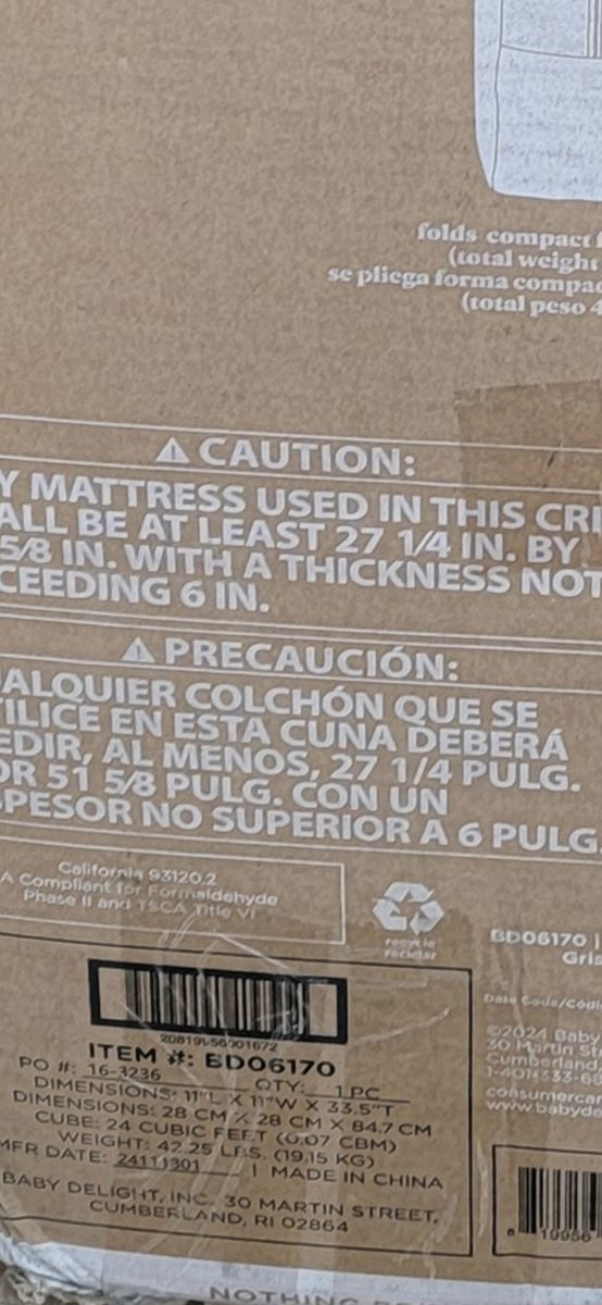 Baby Delight Lunaire Full Size Mesh Baby Crib & Playard, Driftwood Grey Meets both crib and playard ASTM Standards Tool-free assembly – sets up in minutes Compact fold and storage bag included (40lbs.) Uses a full-size mattress (not included) - includes playard mat Soft quilted fabric and mesh sides for comfort and safety Stylish design to fit your home décor More structural integrity than a playard to support a full-size crib mattress Recommended for use with 0–3-year-olds