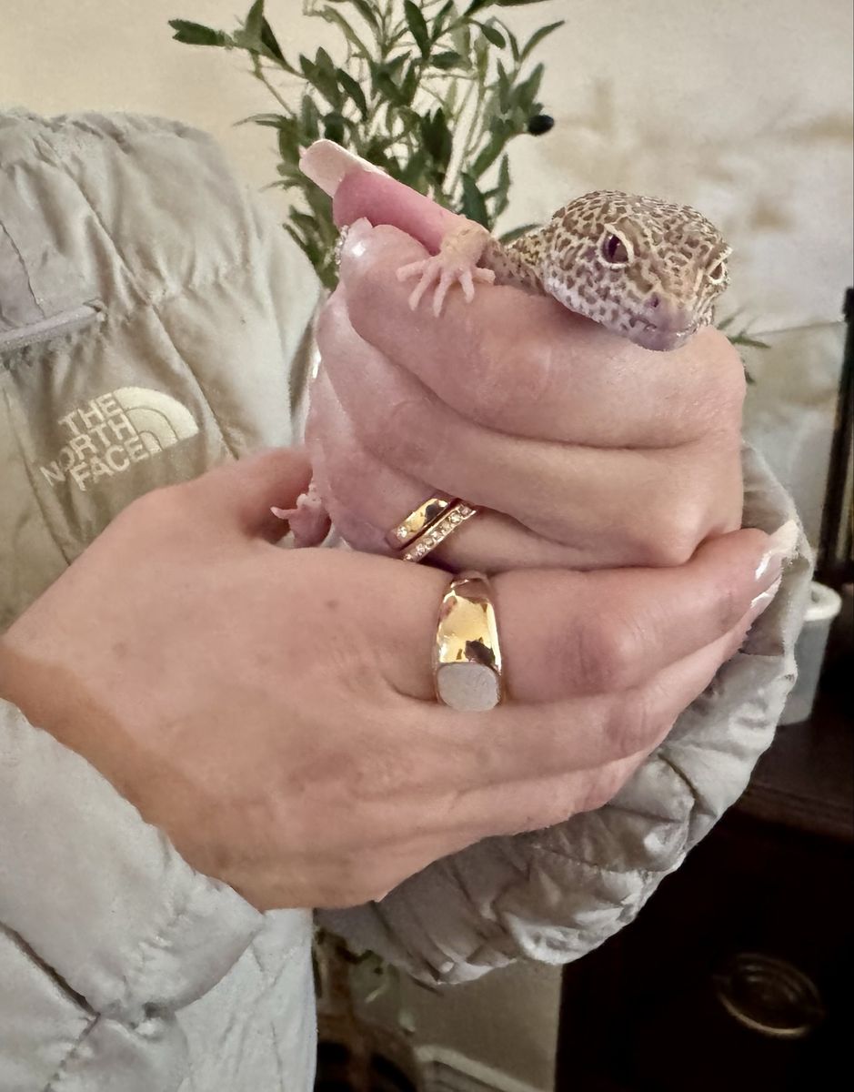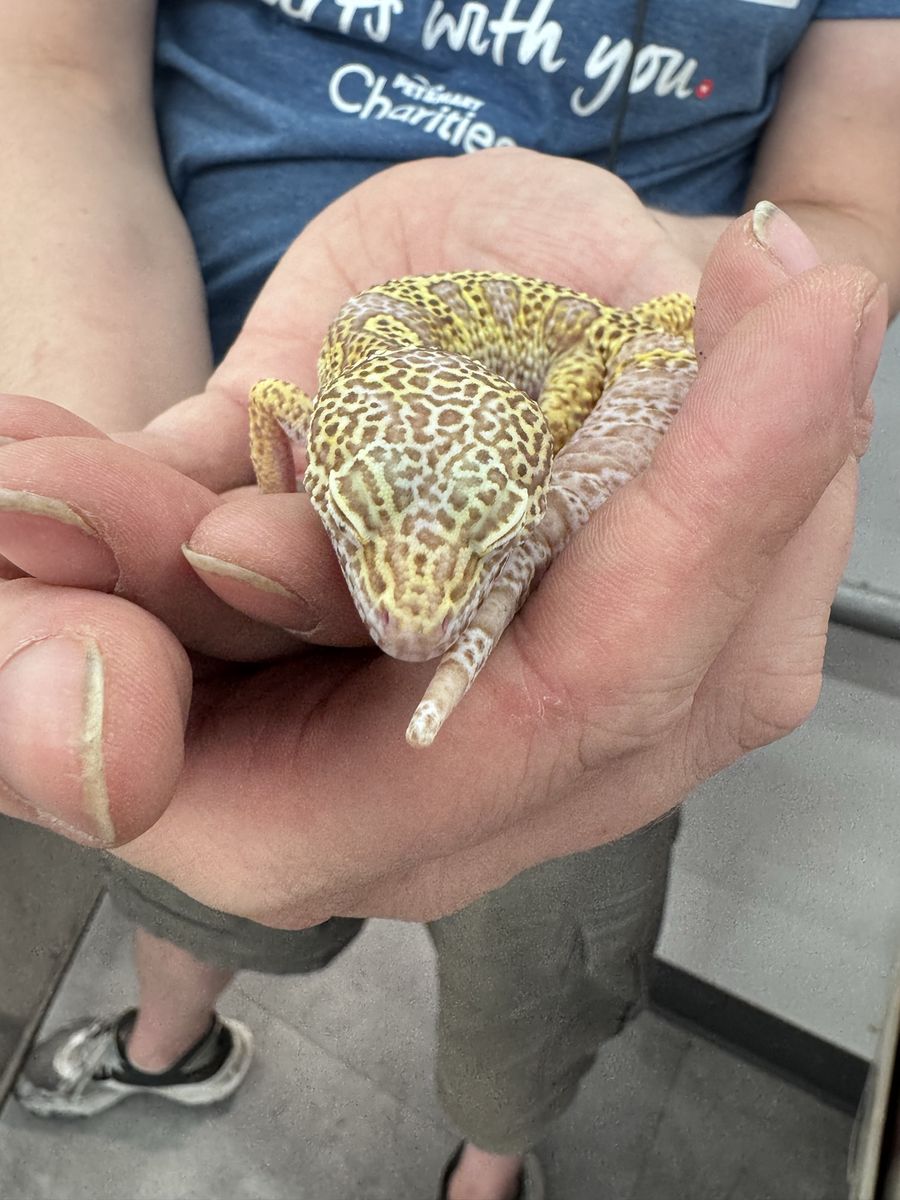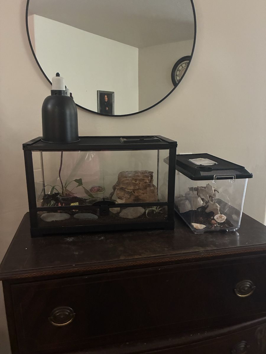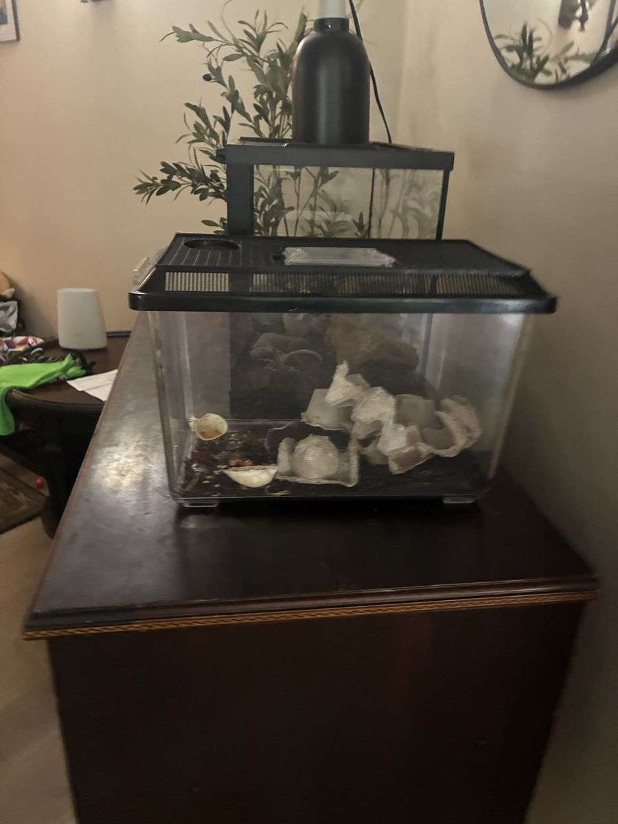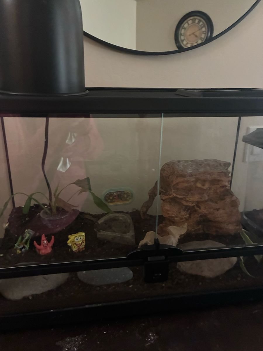 He comes with a terrarium, heat Lamp, water dish and moisture Hyde also a rock to Basque and hid in. We just need a loving home for him :)