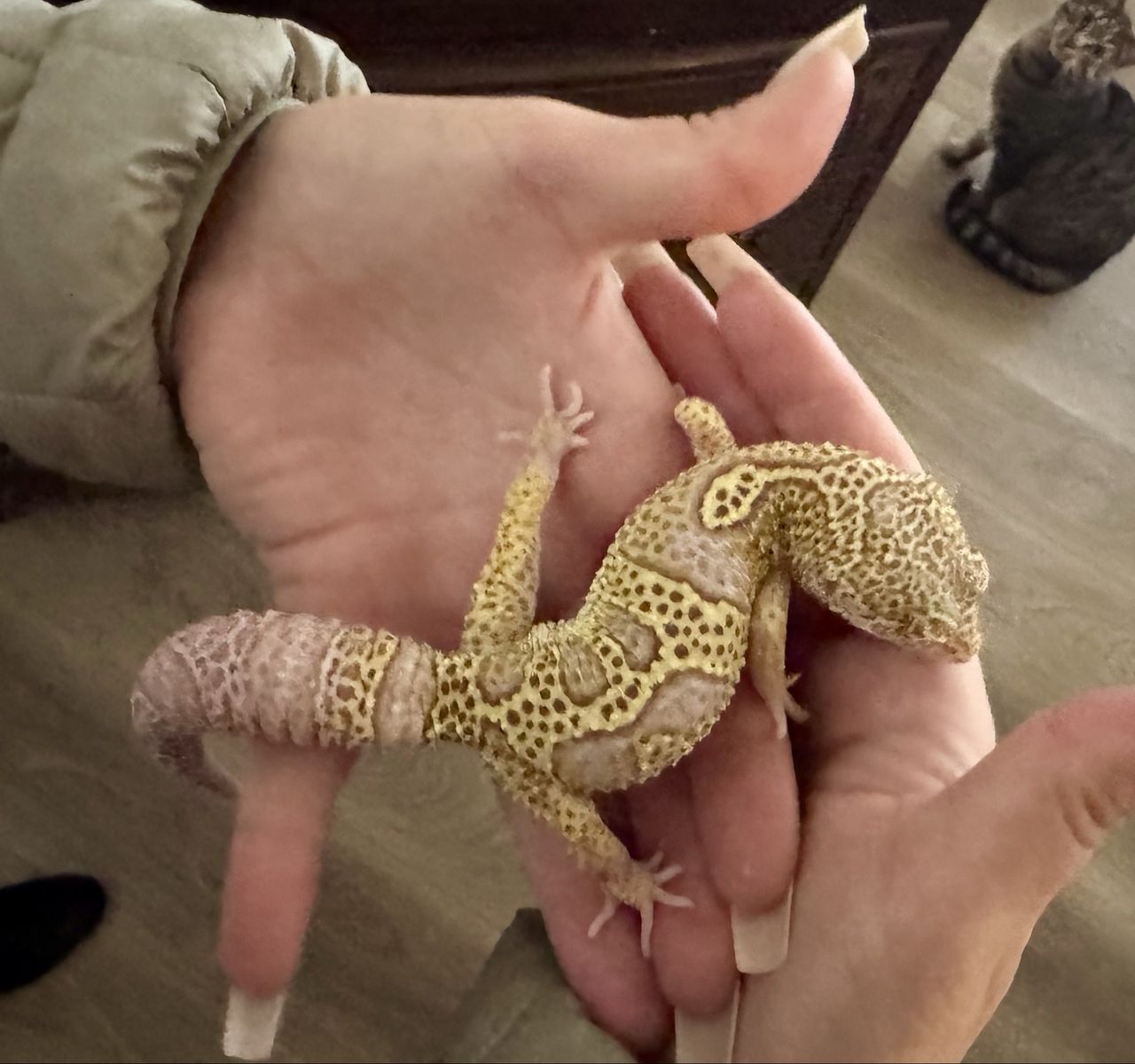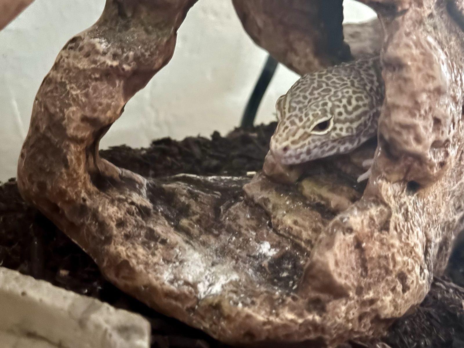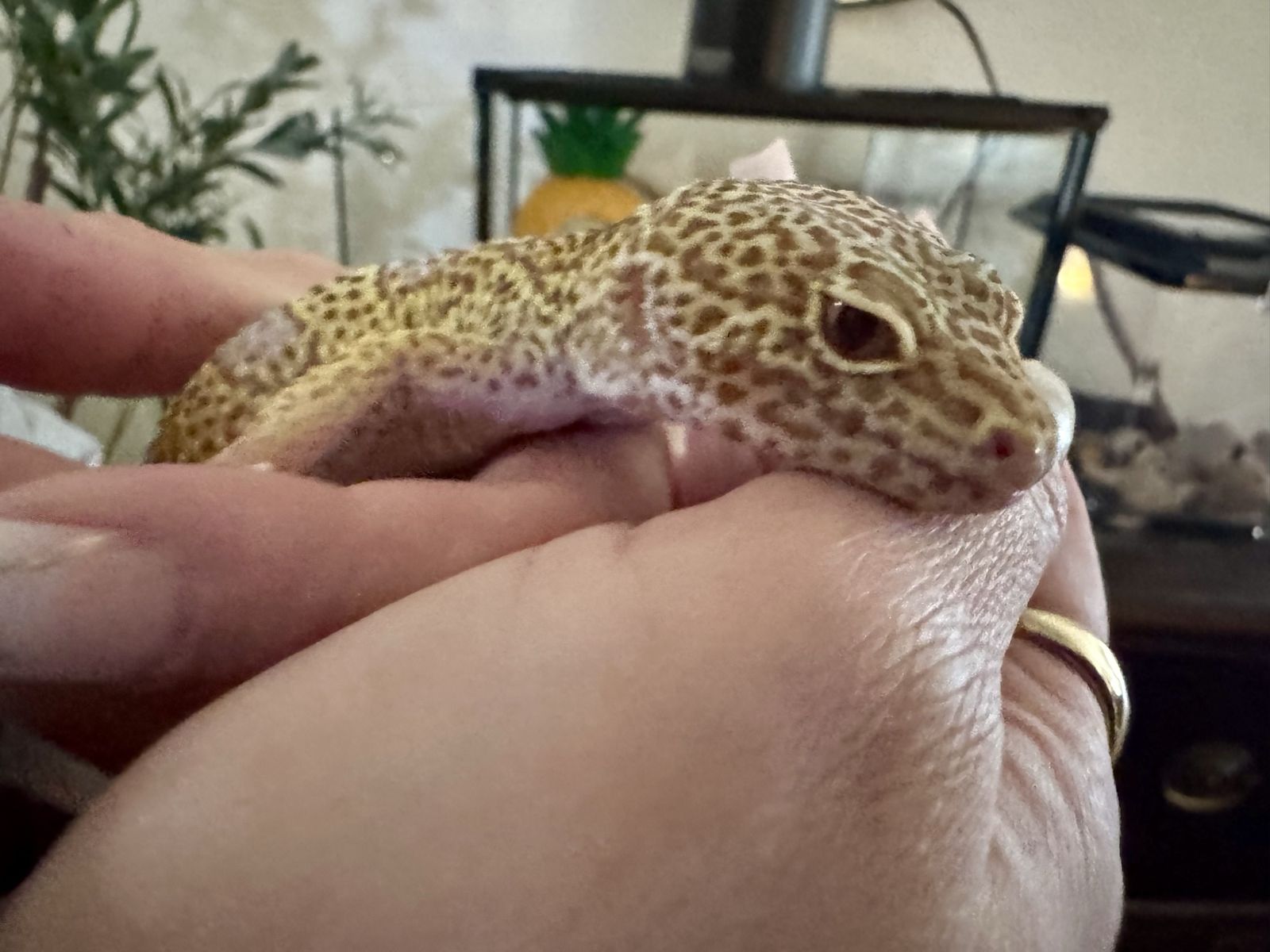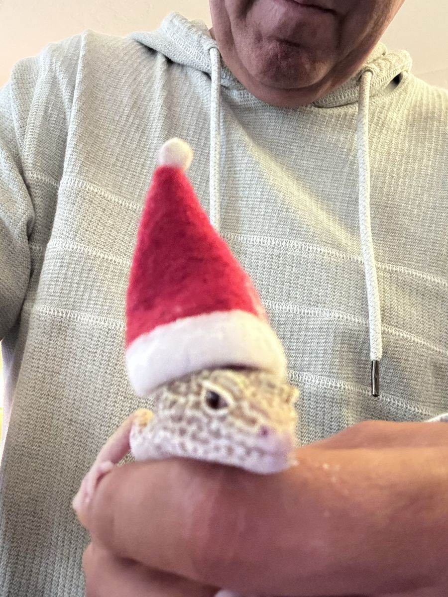 He comes with a terrarium, heat Lamp, water dish and moisture Hyde also a rock to Basque and hid in. We just need a loving home for him :)