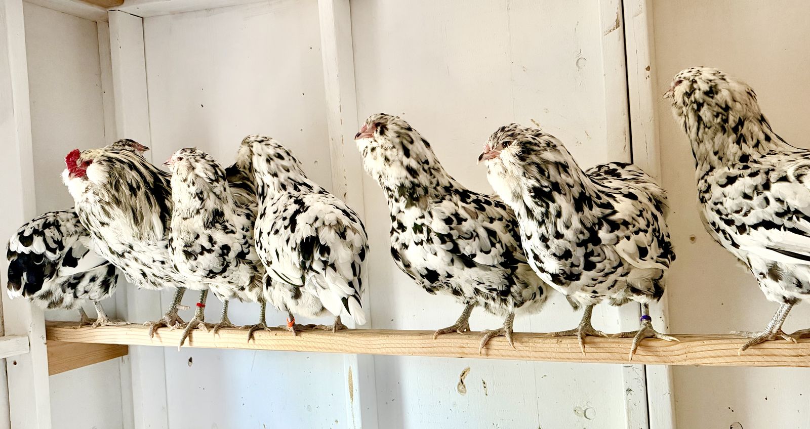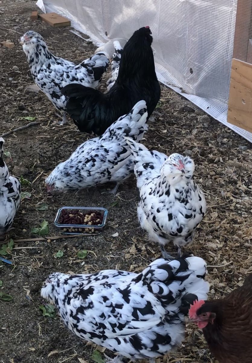 VenmoErmine Ameraucana chicks available from 7 Aspen Farms! These beautiful birds are striking with their white and black feather pattern. Their personalities are friendly and curious, making them great for families. Chicks are healthy and hardy, and come from a clean environment. Chicks range from 2 days to 2 weeks old. Hatching eggs are available and come from birds that have been dna tested for best accuracy of color.