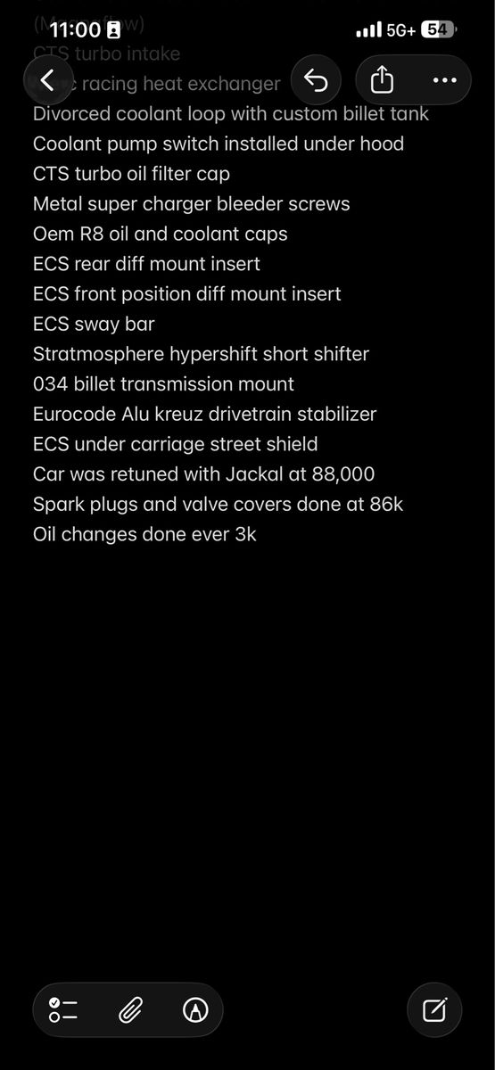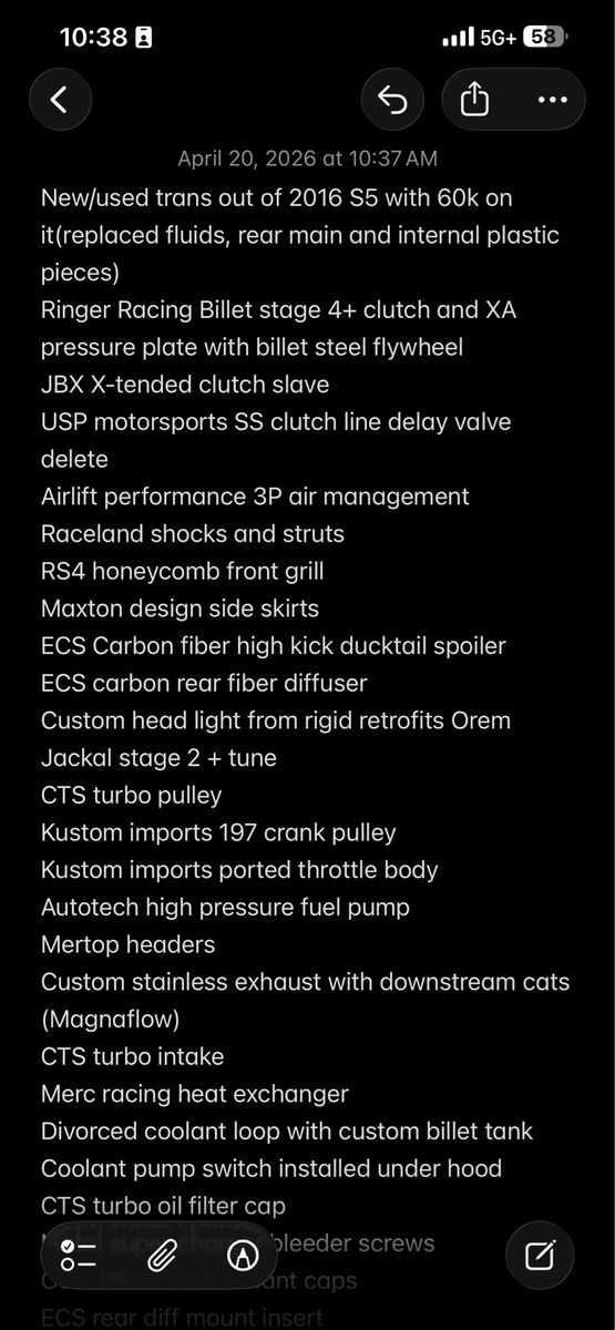 One of the cleanest modded Audi S4 builds out there. Not my daily and doesn’t get driven a lot. Phantom black 2014 S4 6MT stage2+ with new stage 4+ RR clutch, flywheel, jxb slave cylinder, trans fluid, rear main. Never winter driven, Newer trans out of a 2016. (Old one had the input shaft bearing go bad) only 400 miles on setup and still in break in period (spent 8k on this last month) Look at pictures to see what all is done to the vehicle. Only thing it needs is a front windshield eventually because of crack.