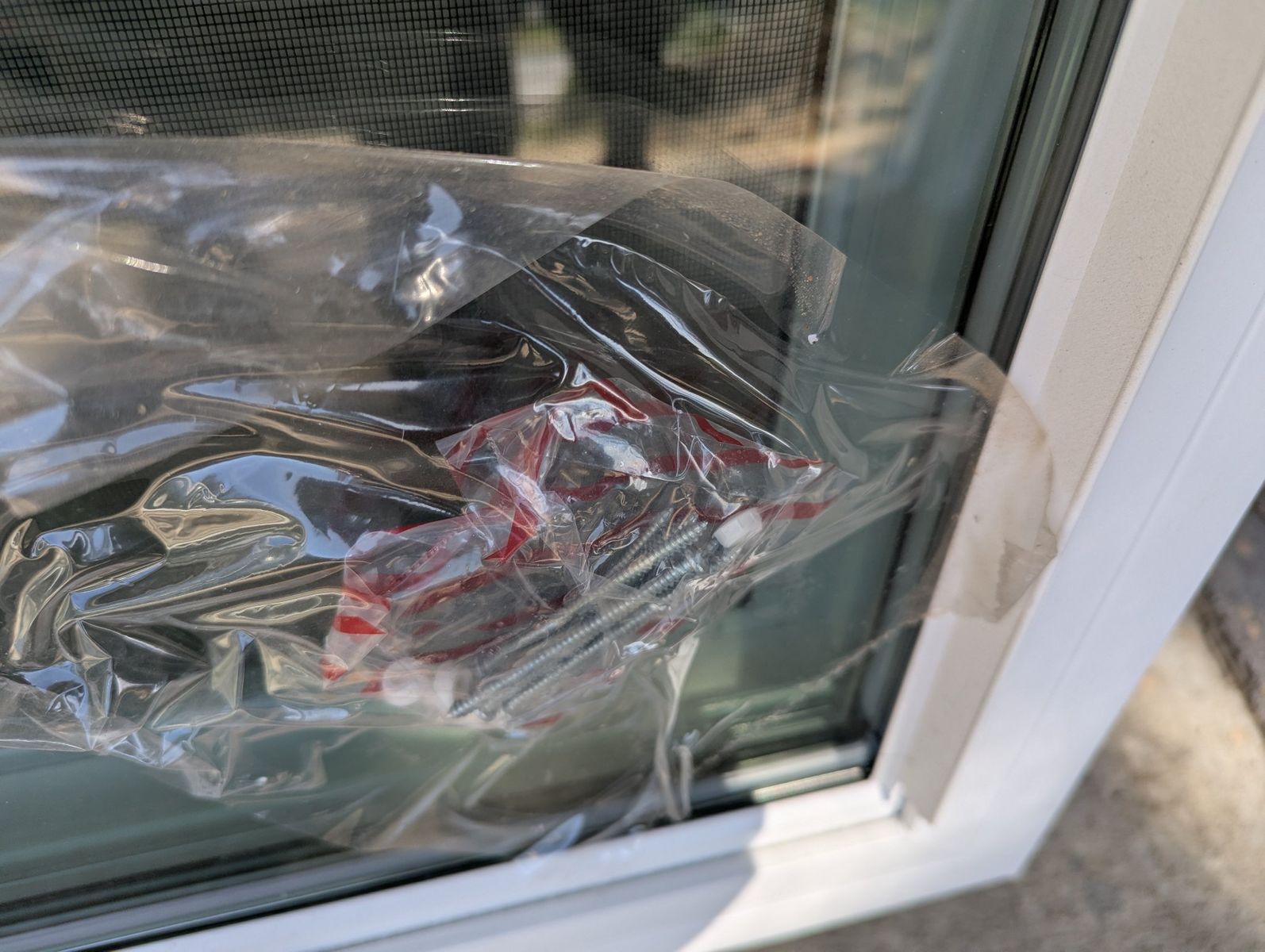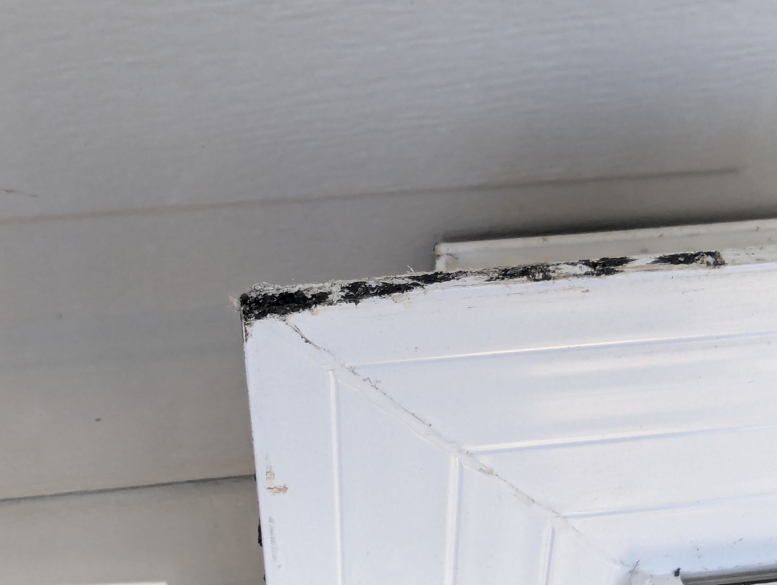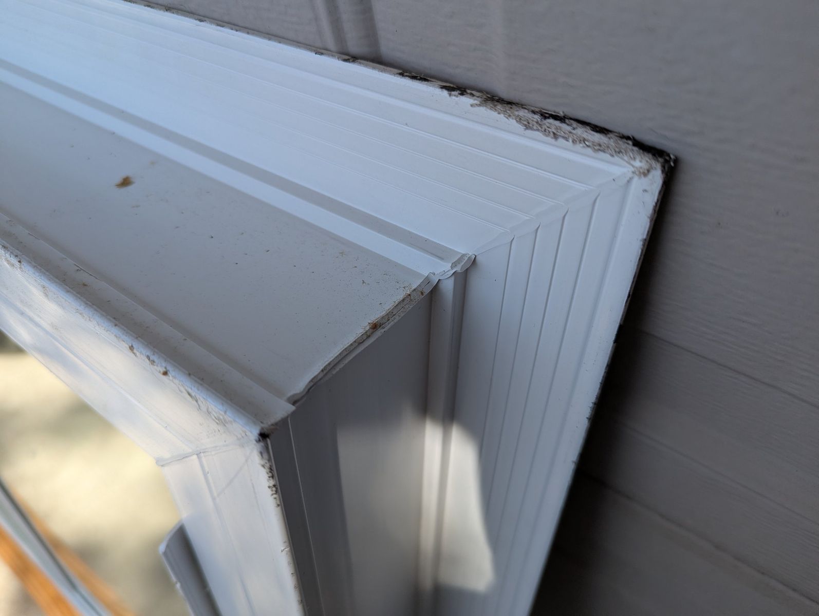 The window is in good condition with some cosmetic wear. There is visible debris and residue present on the exterior frame corners, along with minor surface scuffs on the frame edges.