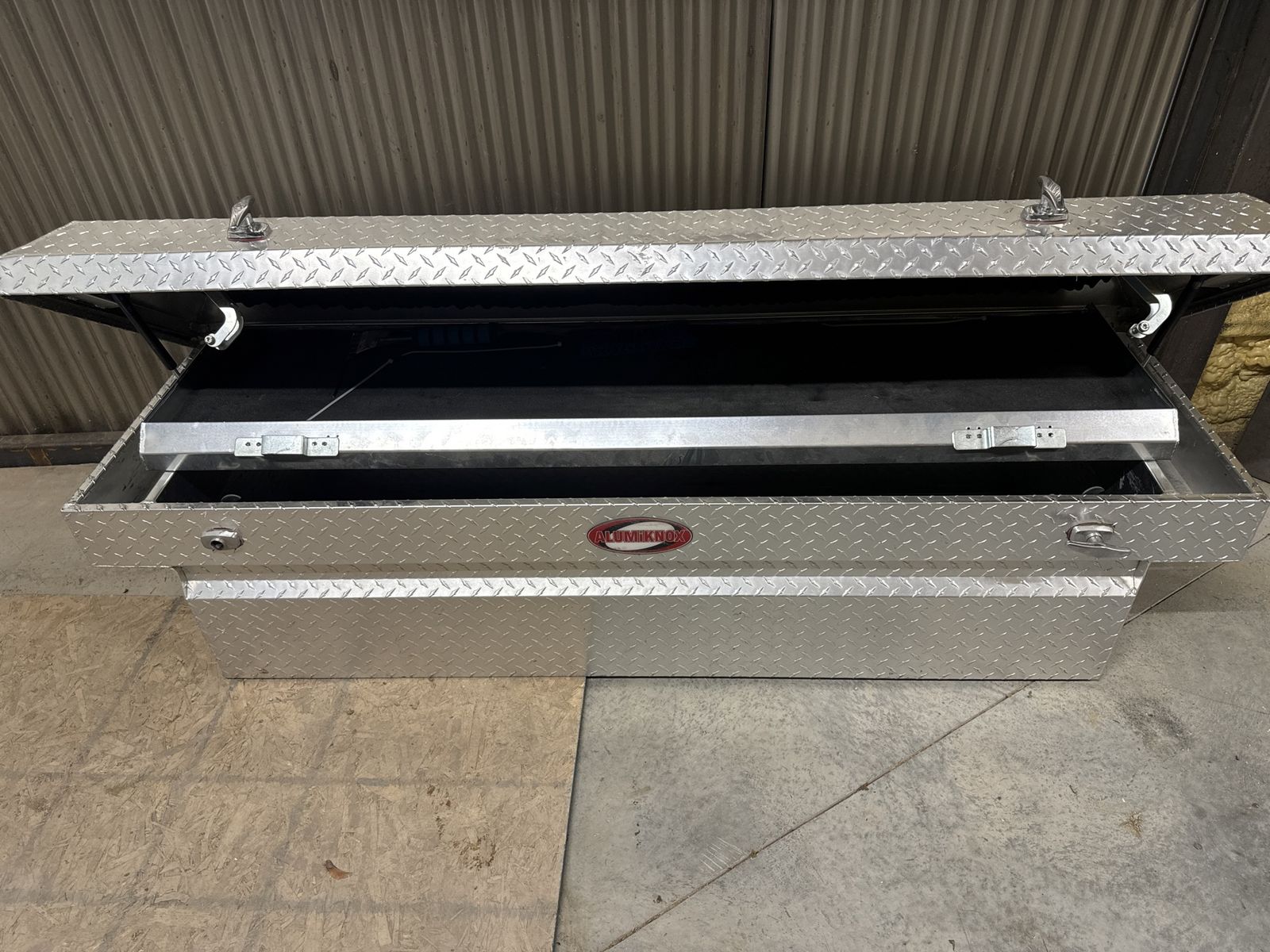 This came in the truck I bought it does not work with my camp trailer as it is too tall one of the lock handles is broken has not looked at it to see if it is fixable or if it just needs a new handle the dimensions of the toolbox 20 inches front to back 71 inches side to side 22 inches tall and in between the bed rail area is 60 and three-quarter inches
