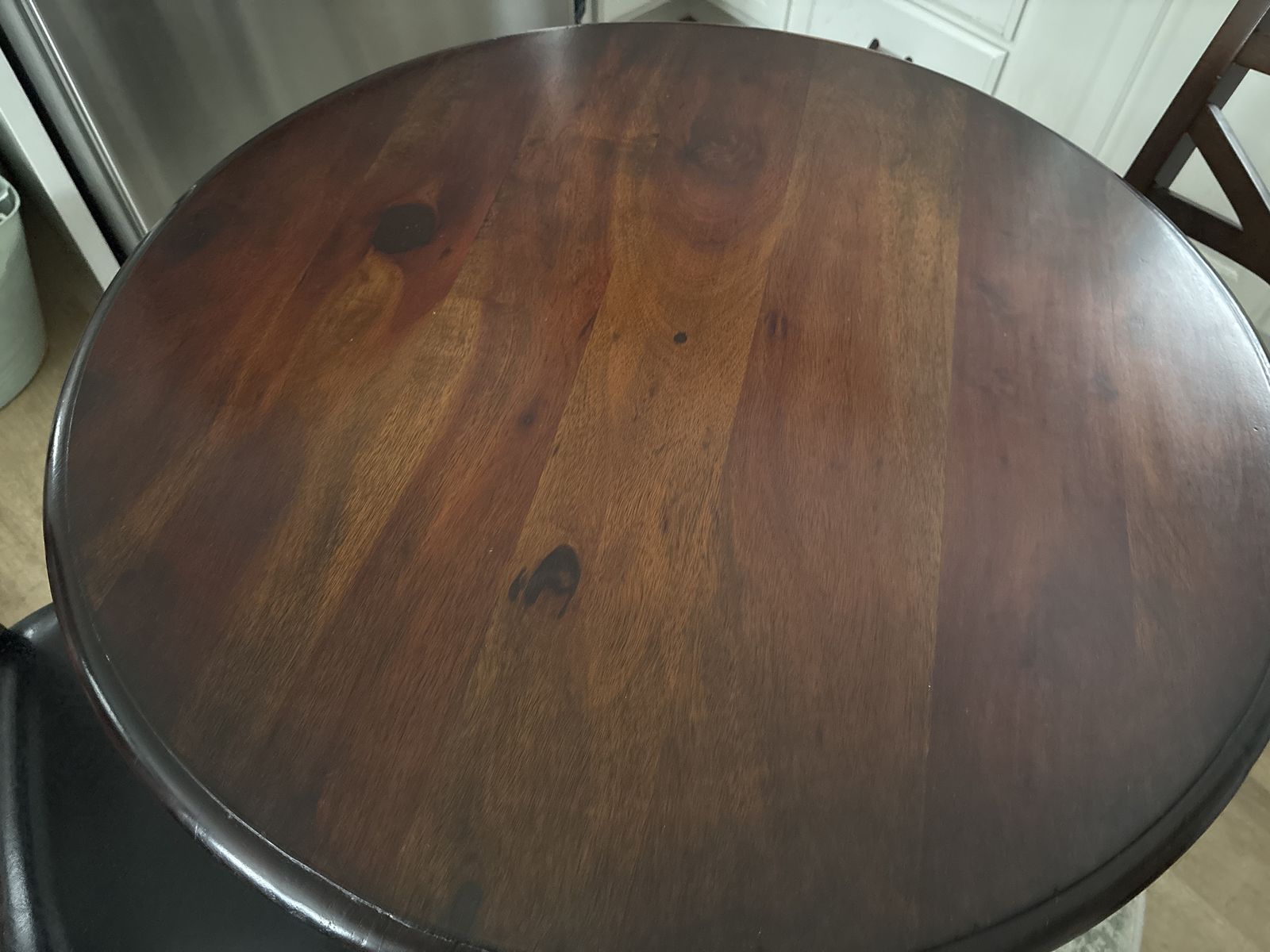 VenmoBeautiful dark solid wood pedestal table with 2 chairs. Excellent quality! Like new condition. 30 inch round table top. Standard height, not countertop height. Will not break up the set. Espresso tone, very slight cherry undertones for the table. The table top screws off for easy transport, This is extremely well made! The base is incredibly unique! $175/set. Cash or Venmo only. In person sale only.