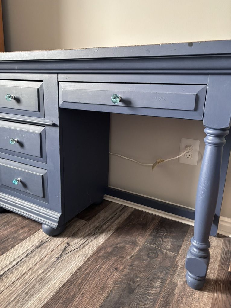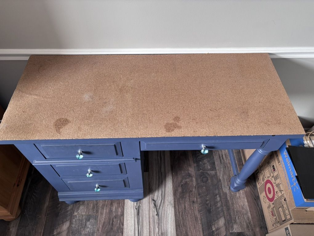 ZelleSolid pine wood. Cork top, which the buyer can remove. Has some stains on the cork but desk itself is fine. Moving, make an offer. Come pick it up