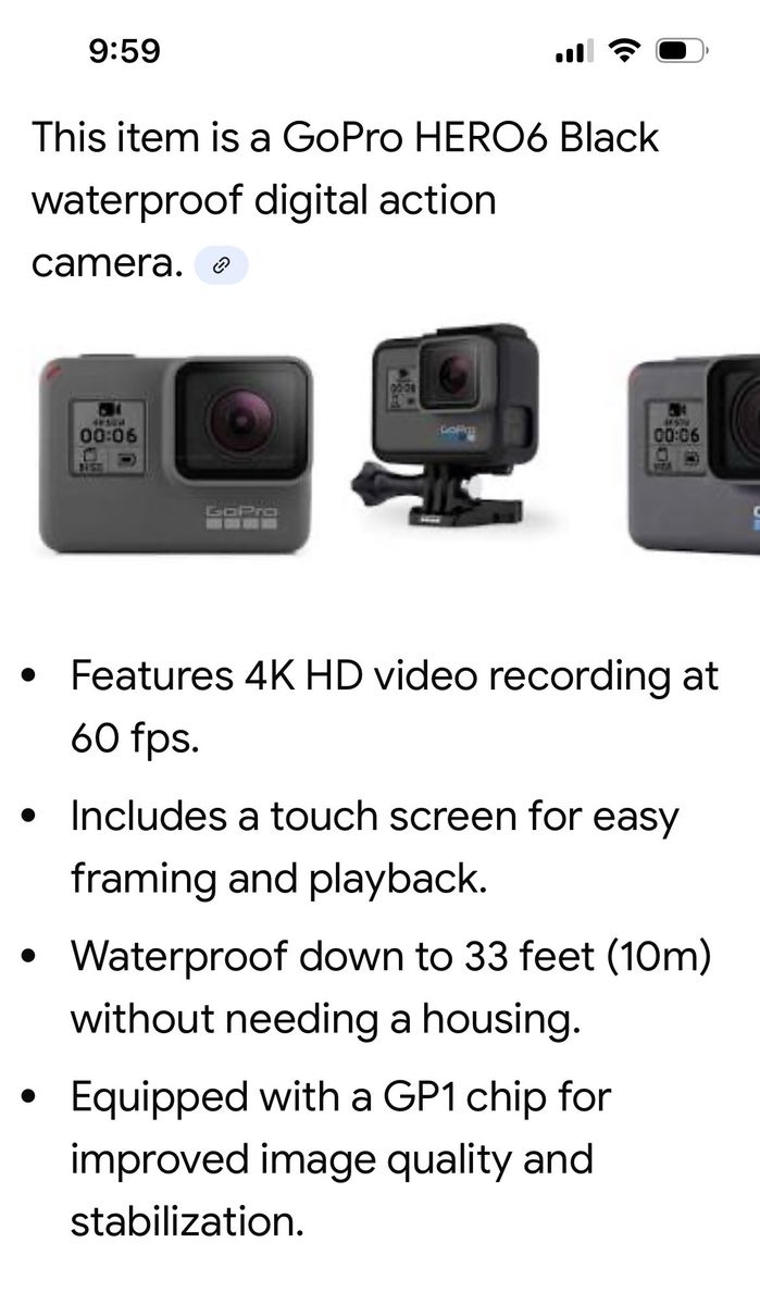 VenmoFeatures 4K HD video recording at 60 fps. • Includes a touch screen for easy framing and playback. • Waterproof down to 33 feet (10m) without needing a housing. • Equipped with a GP1 chip for improved image quality and stabilization.