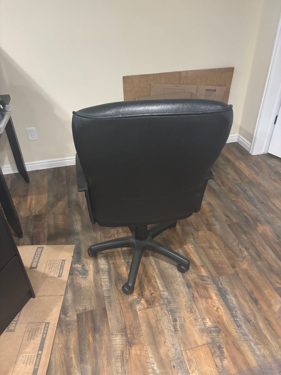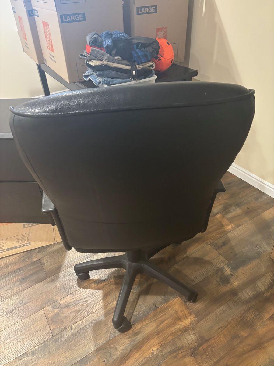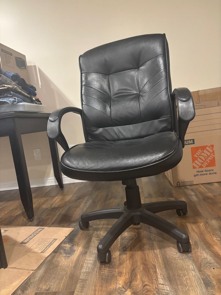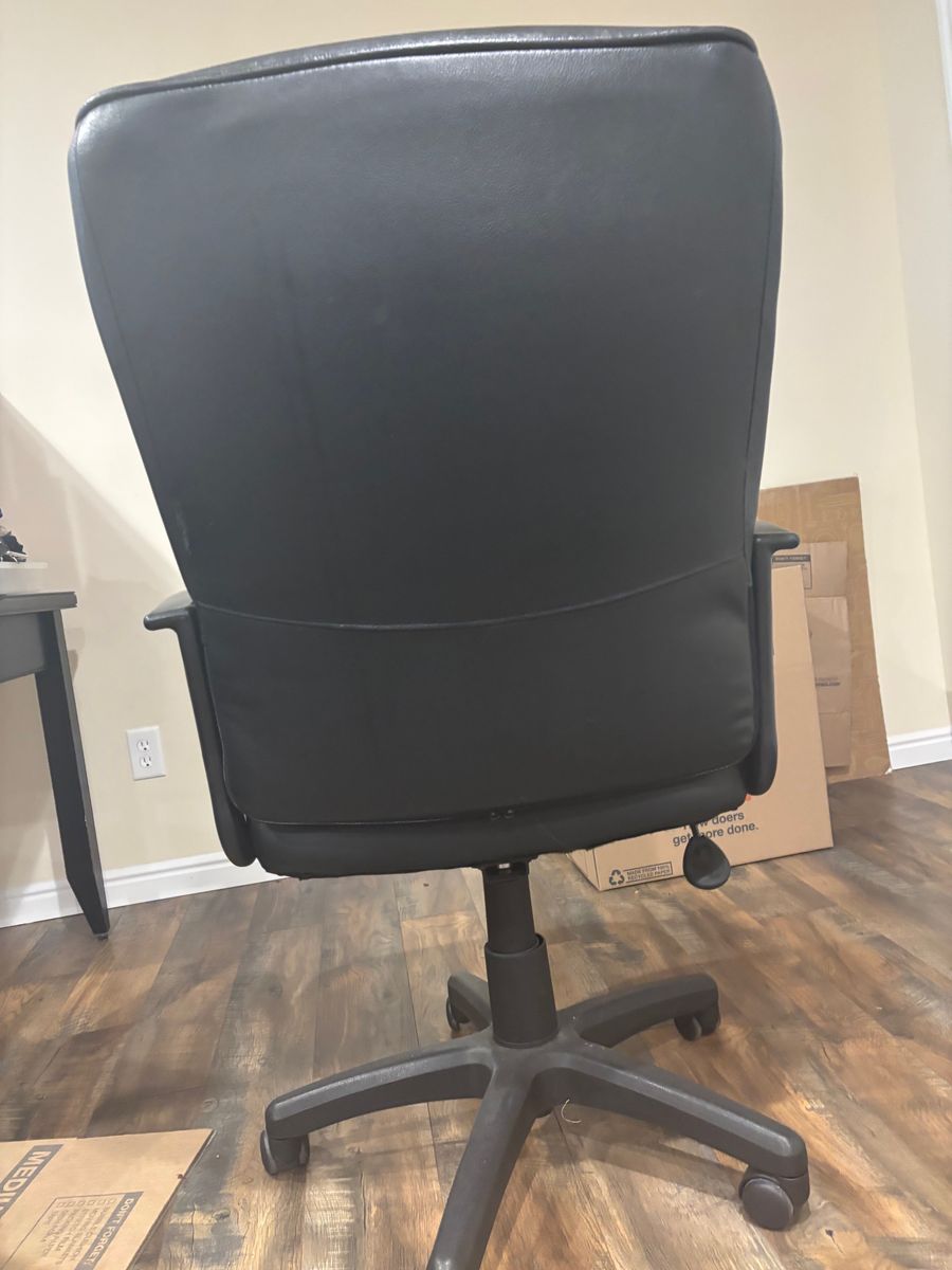 We have here an oldie but a goodie. $20 office chair, no major tears, and expected wear as you can see from the photos. All the wheel work/ are NOT broken, and it raises and lowers as it should. We just no longer need it.