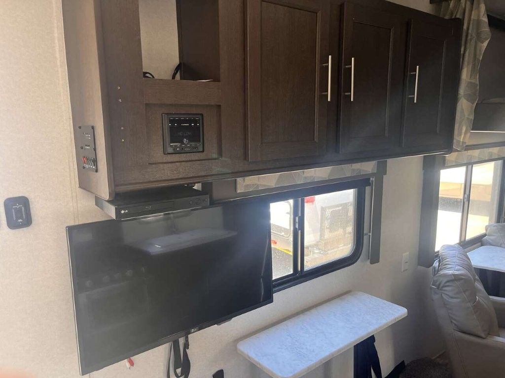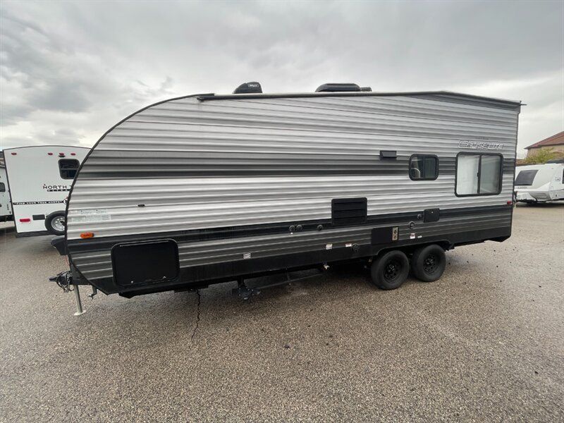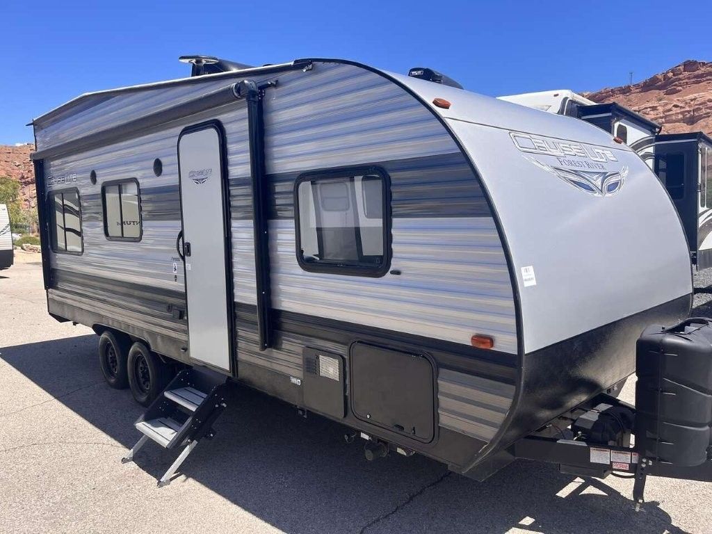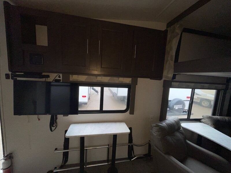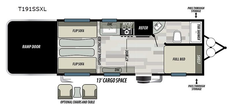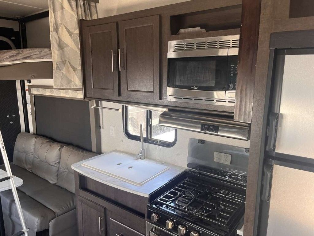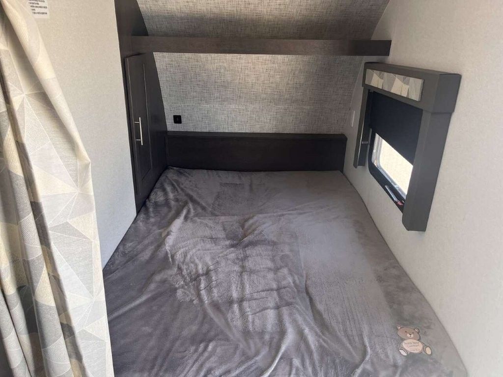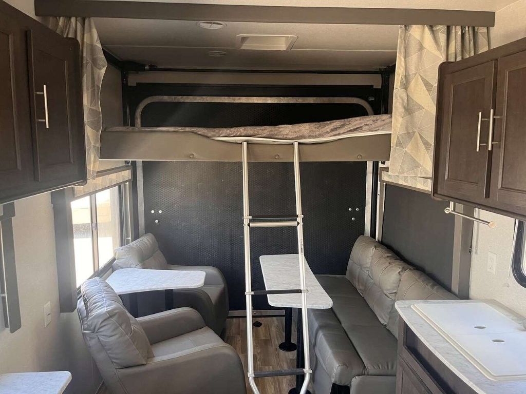 It was purchased for $25,000.00 on 03-02-2023 from Bish's RV. This is a 20' foot toy hauler with 14' of open storage ideal for hauling ATVs or motorcycles. This is a basic but clean toy hauler with all the options you need to enjoy getting out with the family and friends with out spending a ton of money. This unit has options that include a microwave, cooktop, refrigerator, roof top a/c, full front corner bath (toilet / sink / shower), power awning, power jacks, power tongue jack, heated holding tanks for winter use, front full size bed as well as rear queen power bunk, plus a folding full-bed / couch in the rear, and two nice free standing rocking chairs. (sleeps 4 to 6)