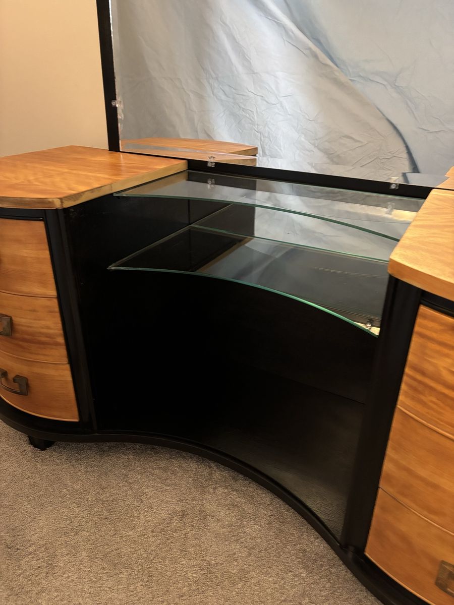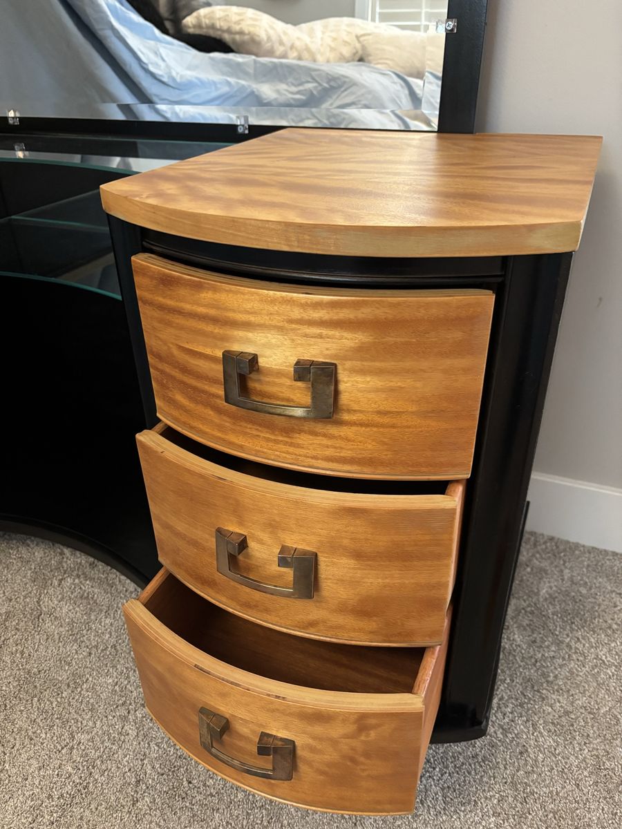 Zellethis charming vanity has a huge mirror. all drawers work and the finish glows a deep caramel color. gotta see it to truly appreciate! $300