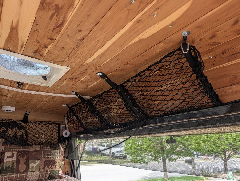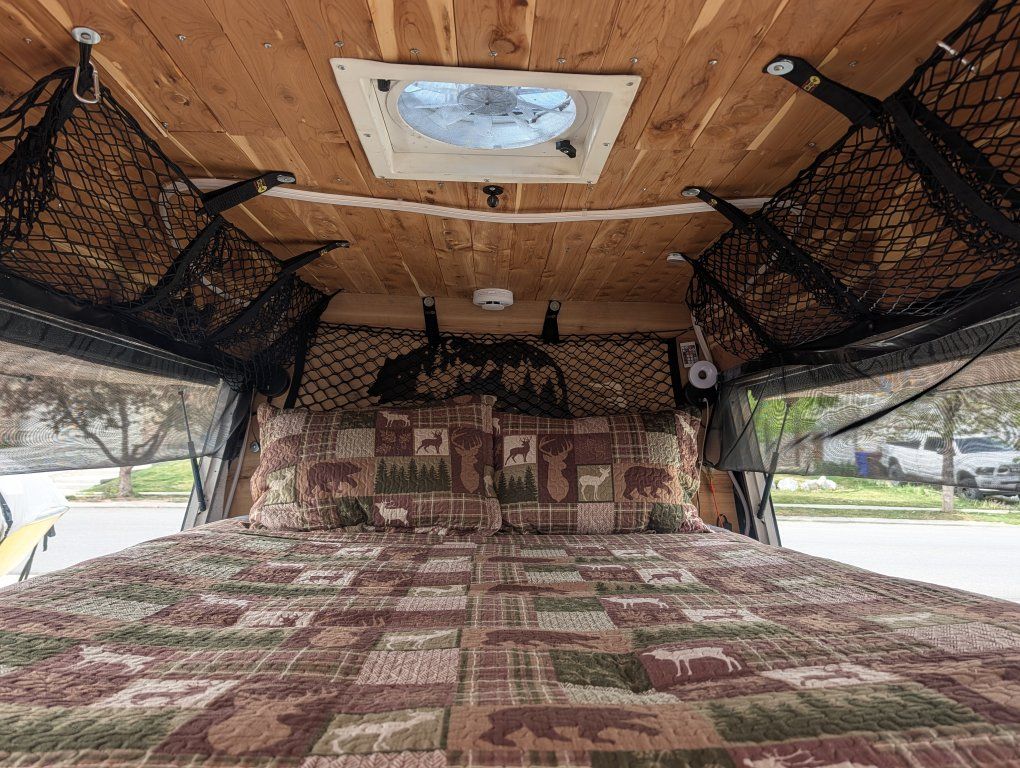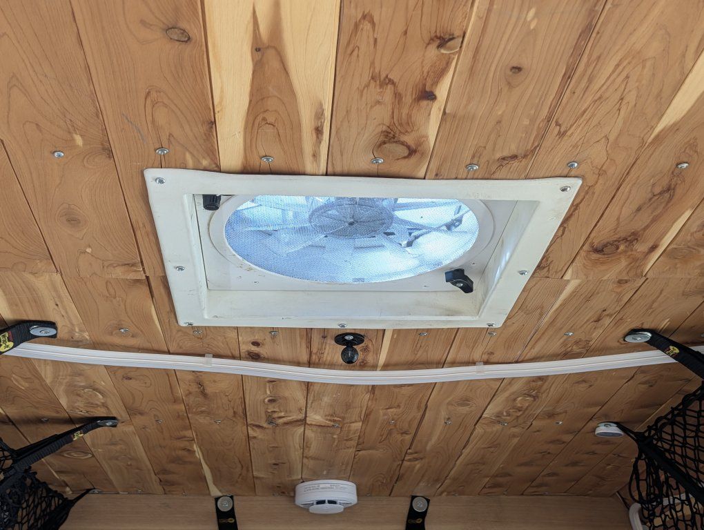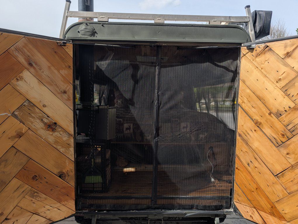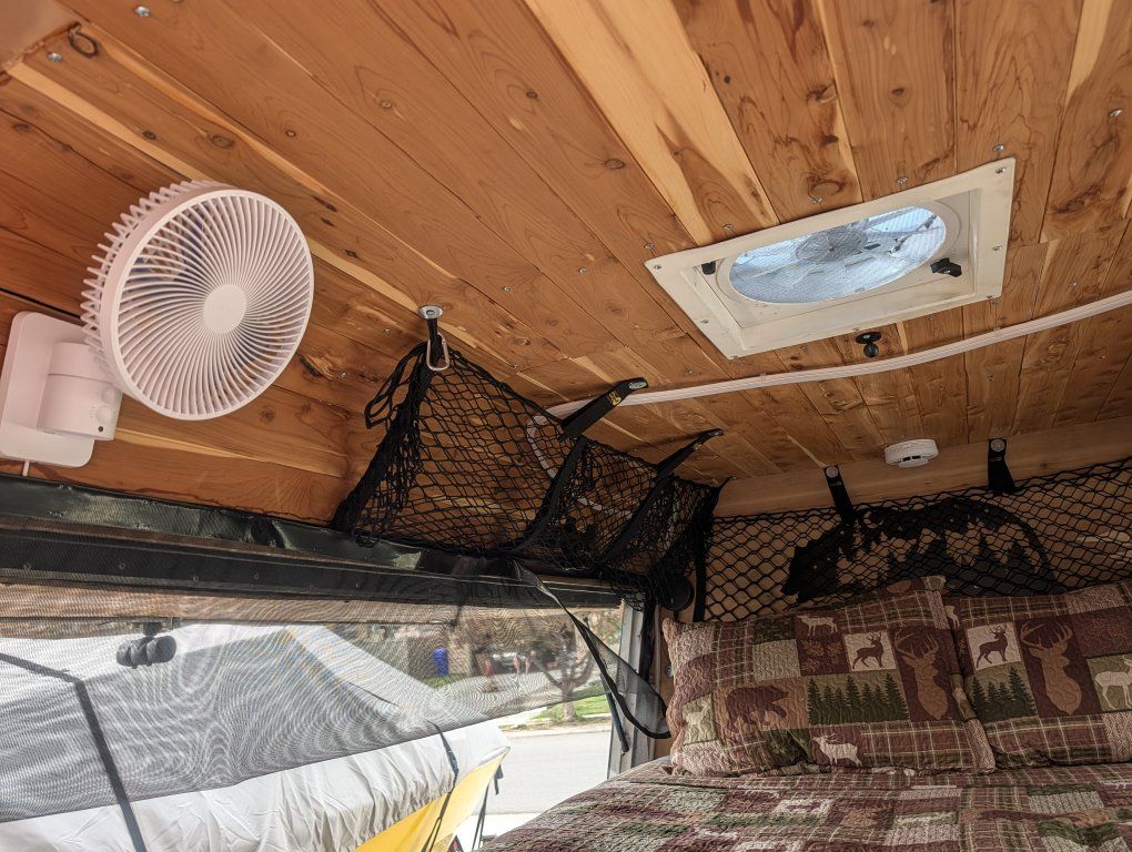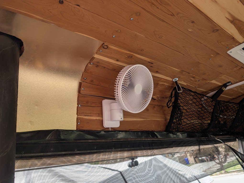 Ventilation: 12V roof vent, oscillating wall fan, and full screens for the side openings and rear door.