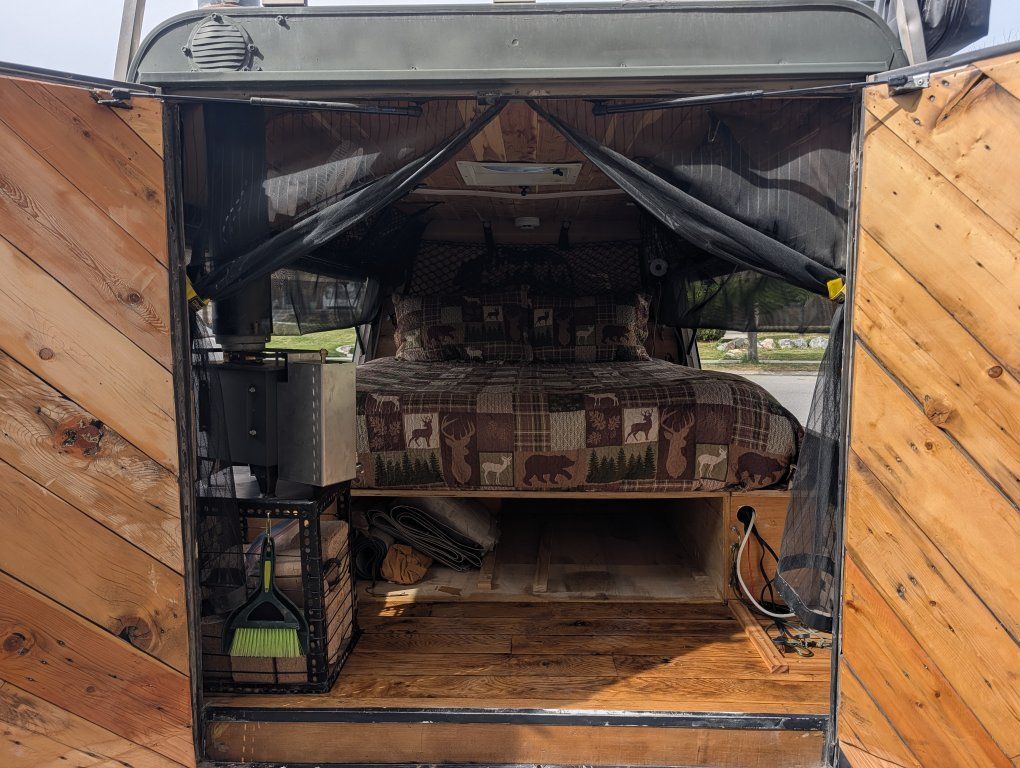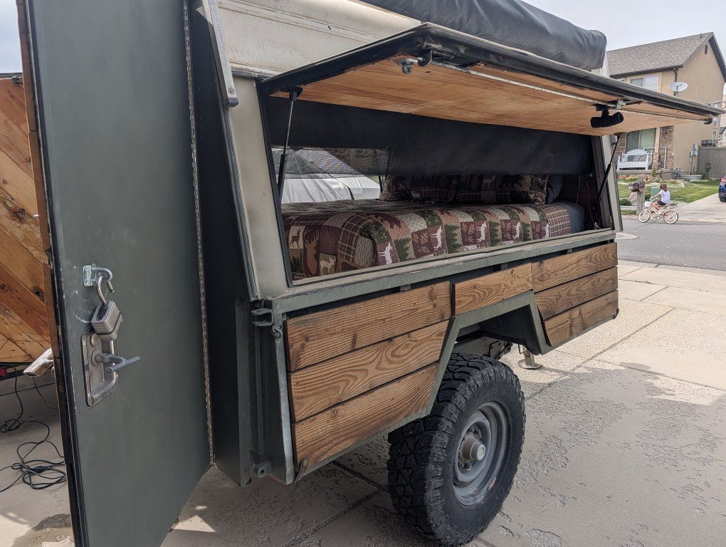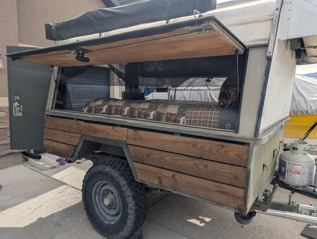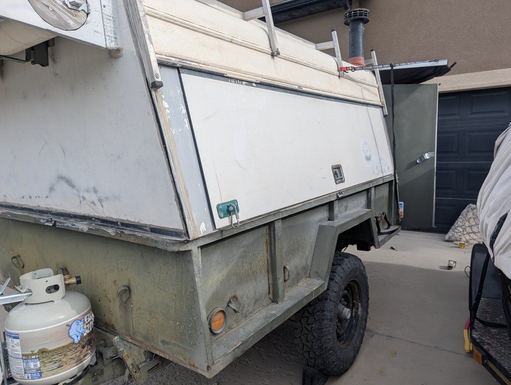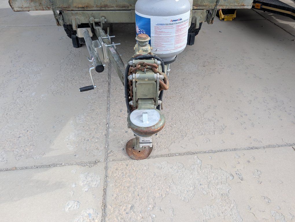 Details: The trailer has a clean title in hand. It features dual propane mounts and a heavy-duty jack with a custom drill attachment for rapid leveling. It is structurally sound and dry. The exterior is a bit ugly but ready for a fresh coat of paint; I can provide the specific military green spray paint color used on the rear doors if you want to finish the look.