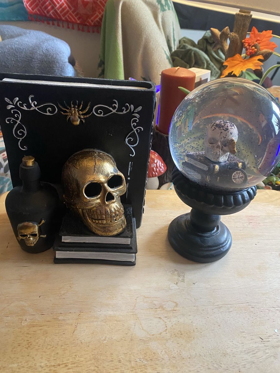 Bat blood stand $1 Raven bottle stand $1 Red blood bat bottle $0.50 Spider bottle $0.50 Snake candlestick $2 Raven candlestick $2 Skull globe $5 Skull book bottle decor $5 lights up.