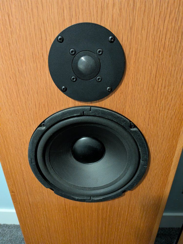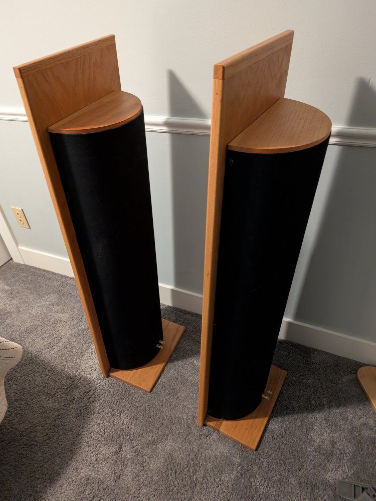 PayPalDana Audio Model 2f floorstanding speakers. Dana Audio was a boutique "factory-direct" company based in Austin, Texas, during the early to mid-1990s. They gained a cult following among audiophiles for offering high-performance sound at extremely competitive prices by cutting out the retail middleman. Technical Profile The Model 2f was designed to solve the "boxiness" common in affordable speakers of that era. Cabinet Design: It features a unique semi-cylindrical, dampened rear cabinet (wrapped in black cloth) mated to a flat, solid oak-veneered front baffle. This design was intended to reduce internal standing waves and improve imaging. Drivers: * Tweeter: A high-quality SEAS 1" aluminum dome tweeter. Interestingly, this is the same tweeter used in several much more expensive high-end speakers from that decade. Woofer: A standard 8" poly-cone woofer that provides a surprisingly full and tight bass response. Sound Profile: They are known for an effortless, smooth musicality with an expansive soundstage, often compared to speakers that cost three to four times their original retail price.