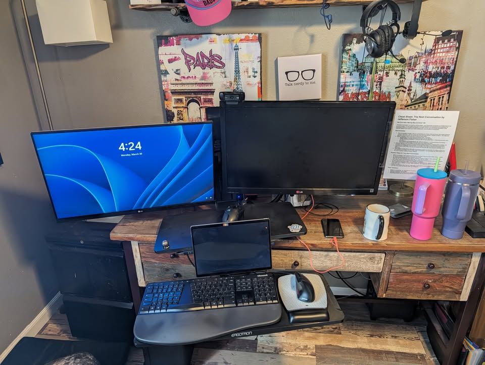 This is a solid, high-quality ergonomic setup, not a flimsy plastic riser. Built like office furniture with a gym membership.