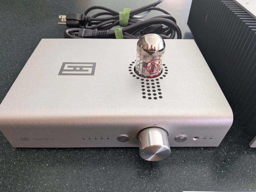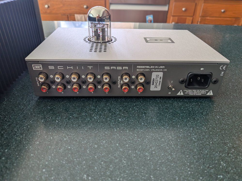 Schiit Saga+ (Tube Hybrid Preamplifier) Type: Remote-controlled passive/active tube hybrid preamp. Key Features: Offers a choice between a 100% passive signal path or a tube buffer stage using the included 6SN7 vacuum tube. Volume Control: Features a high-end 64-step relay-switched volume control, which is much more precise and durable than a standard potentiometer. Included: Milled-aluminum remote and power cables.