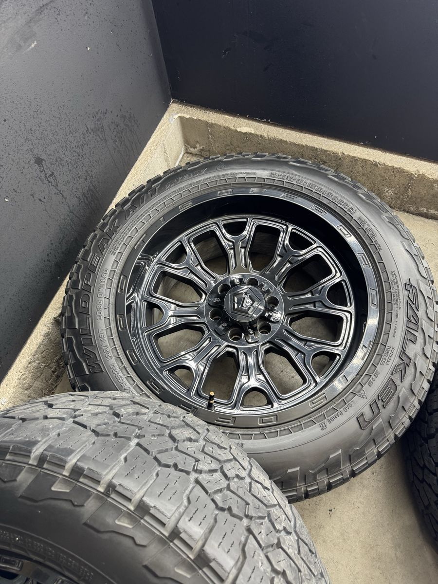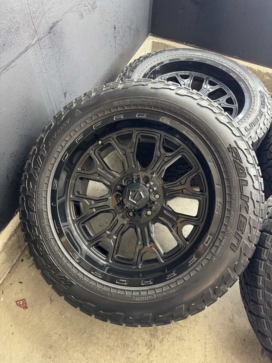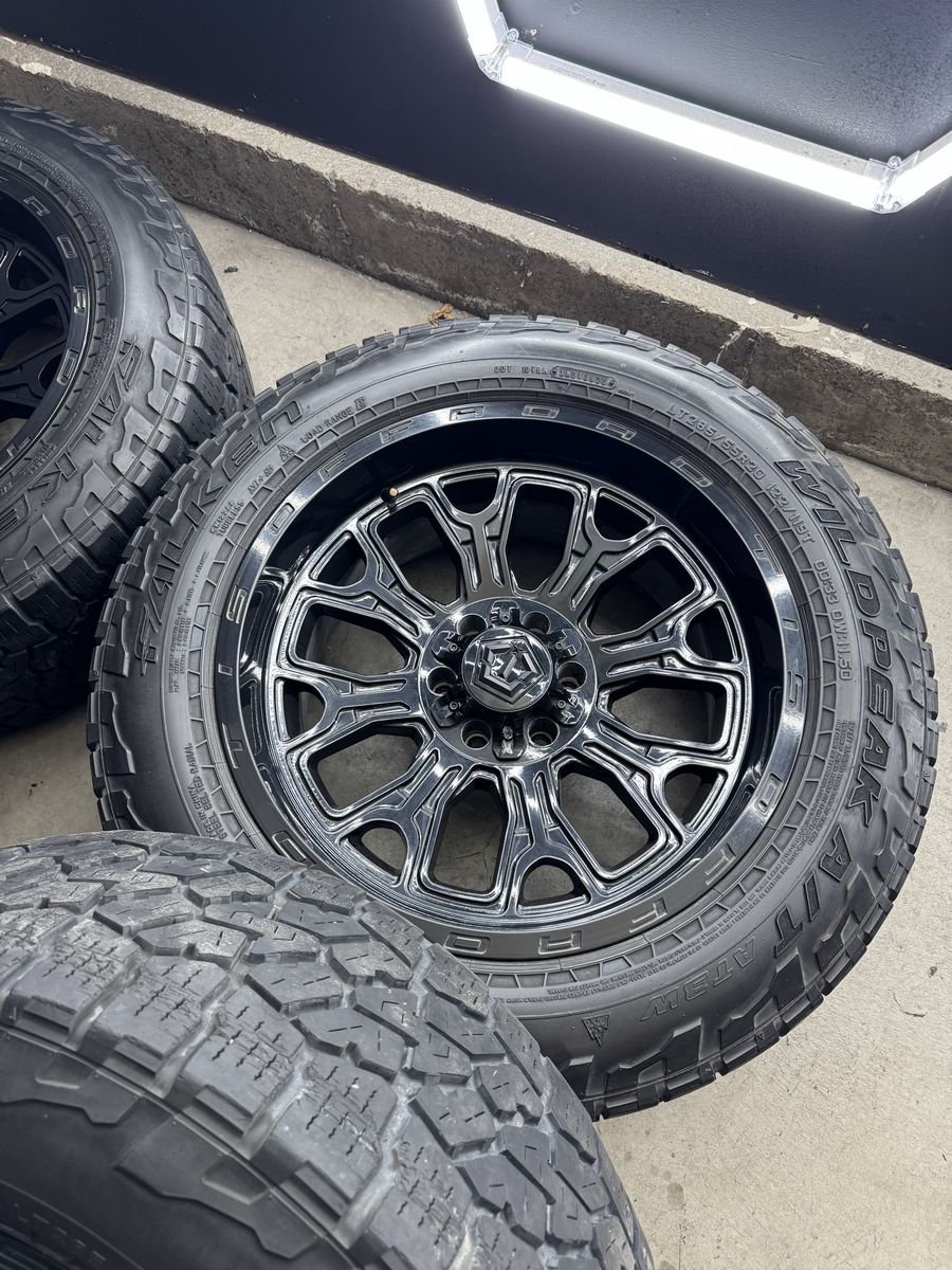 Wheels are 20x10 -19 offset TIS Off Road Wheels. All center caps are included. No major damage to them like cracks or bends. Tires are 285/55r20 Falken Wildpeaks A/T top of the line tires, load range E, 10 ply tires.