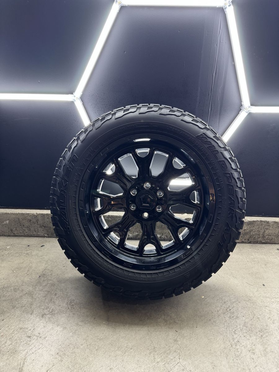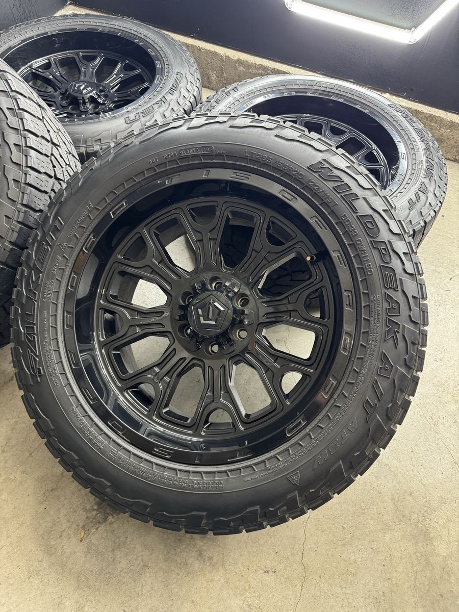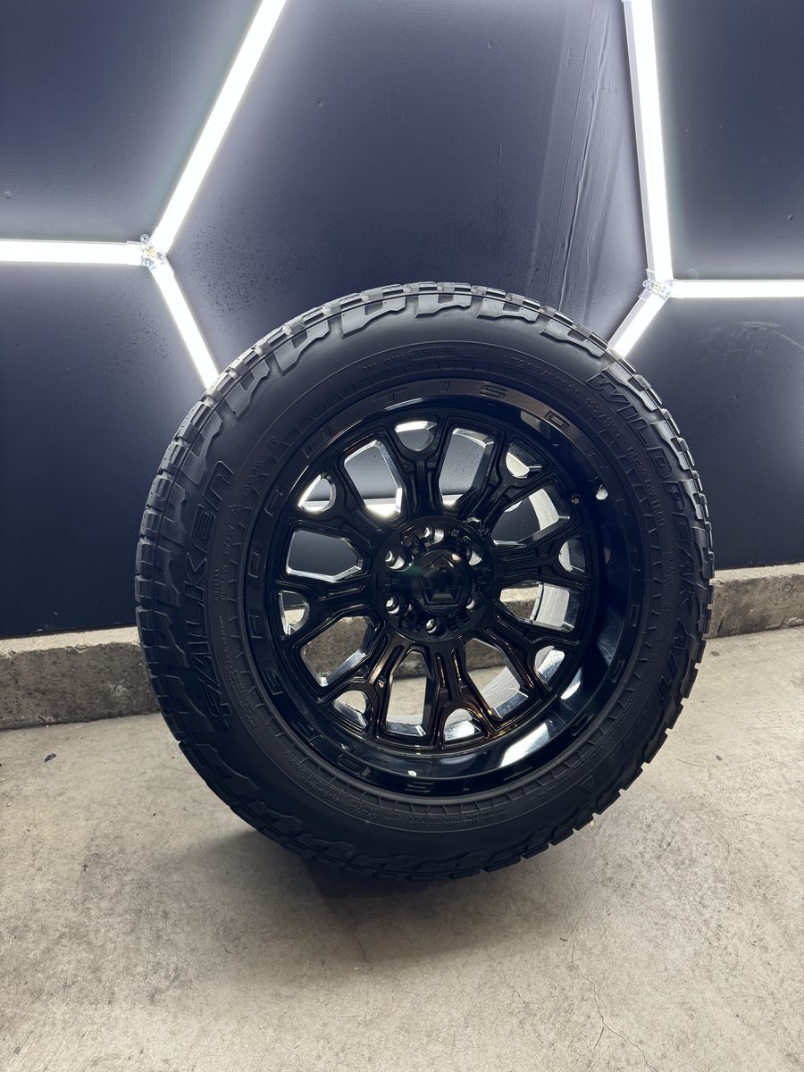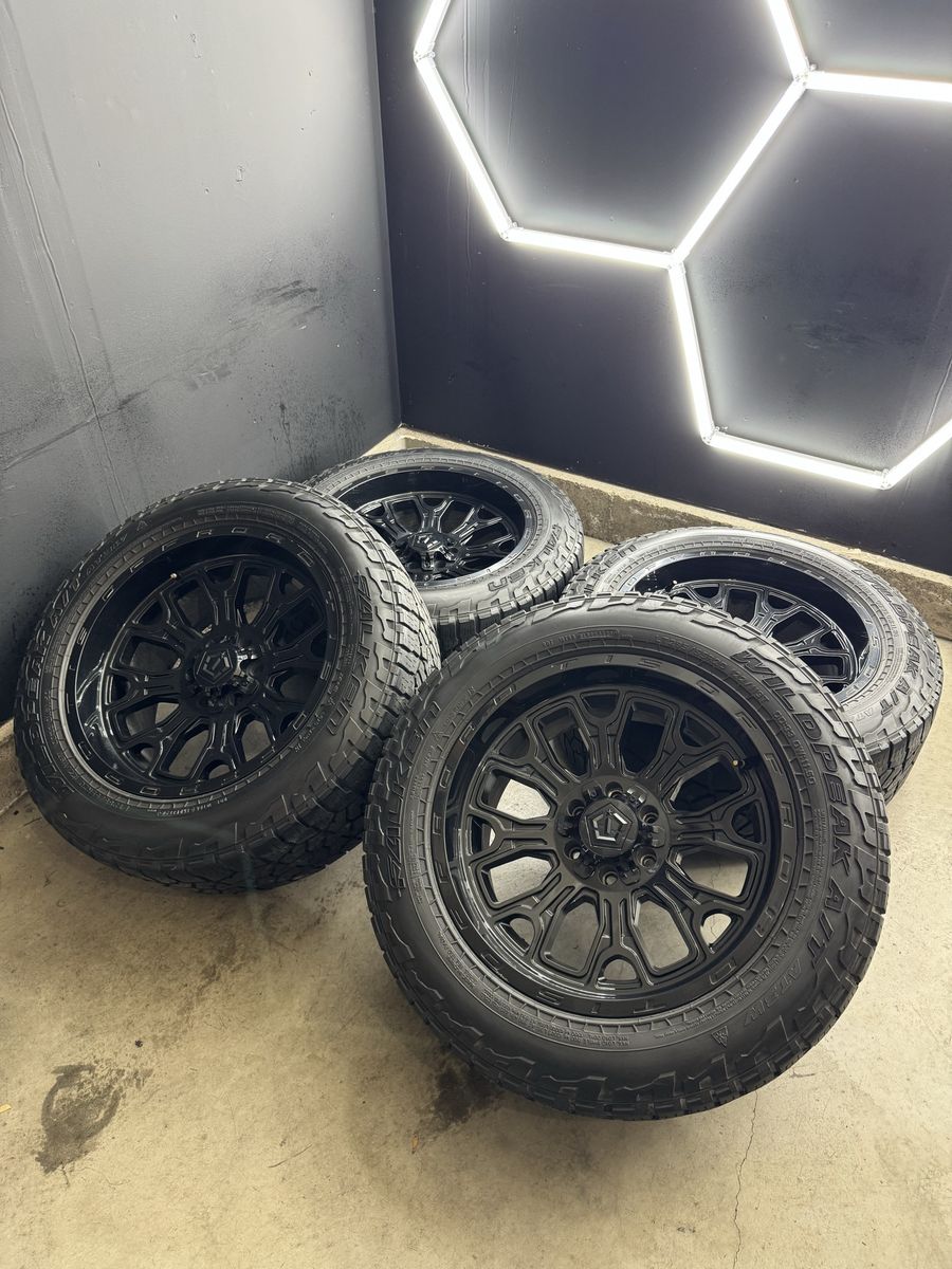 Wheels are 20x10 -19 offset TIS Off Road Wheels. All center caps are included. No major damage to them like cracks or bends. Tires are 285/55r20 Falken Wildpeaks A/T top of the line tires, load range E, 10 ply tires.