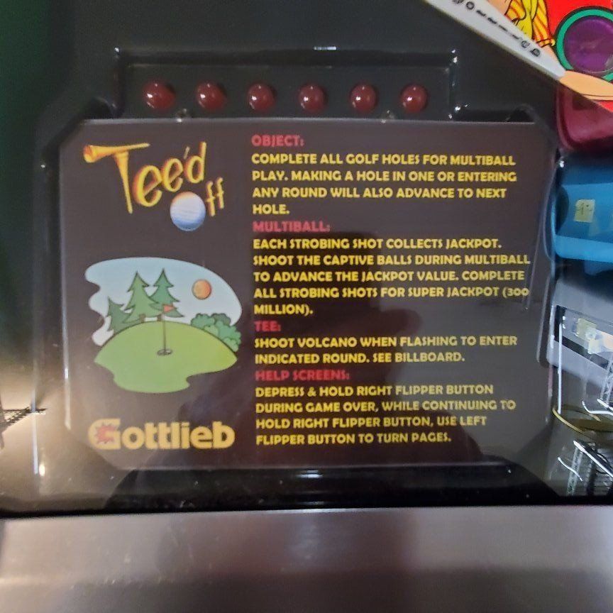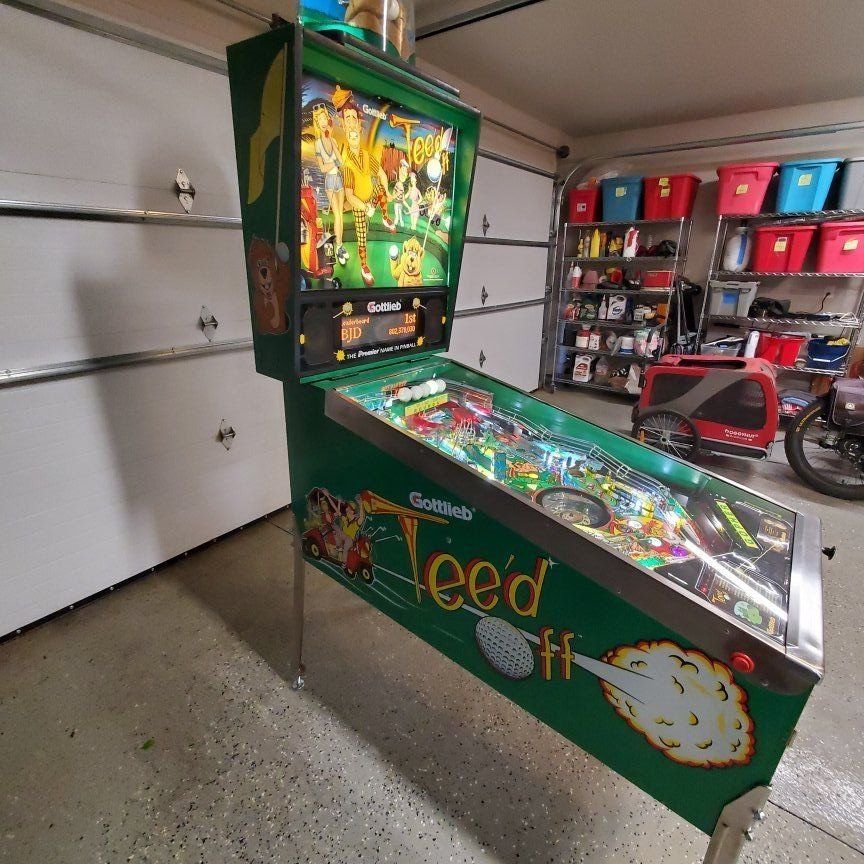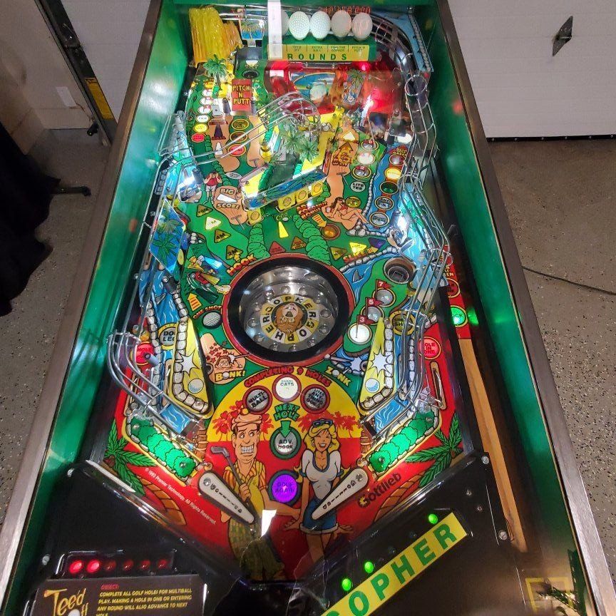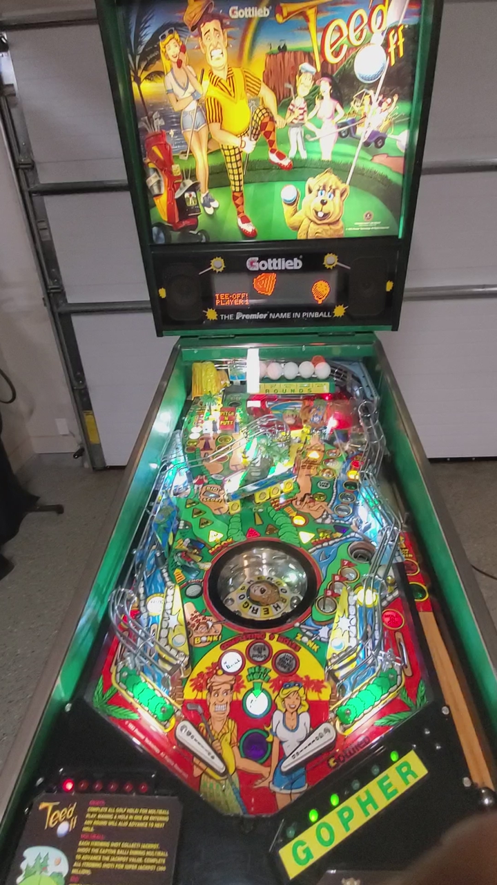 Gottlieb teed off pinball machine with original topper, players condition works as it should, all LED lights, no trades, cash