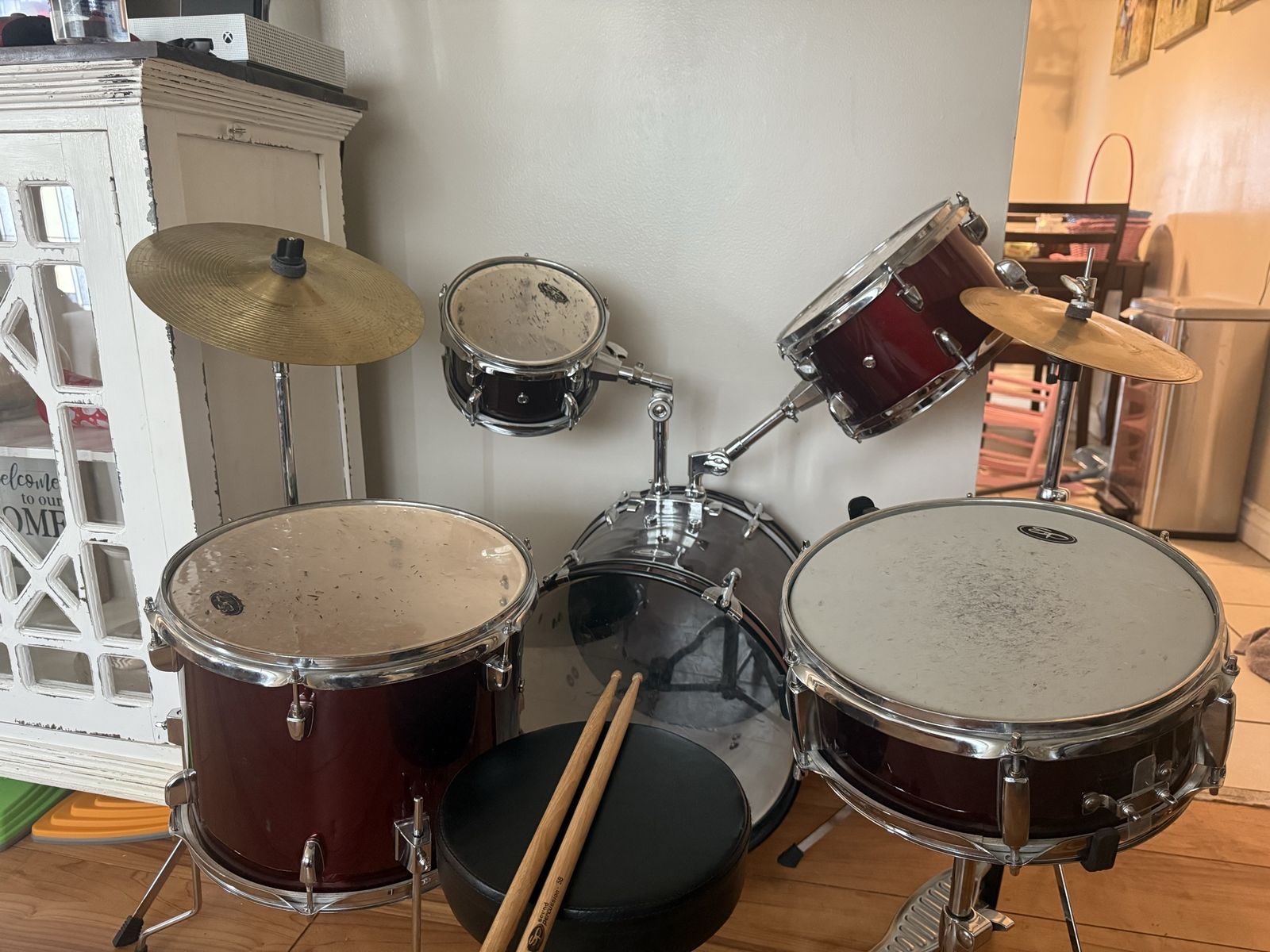 Kids drum set. They have been very loved and used but still have plenty of life left.