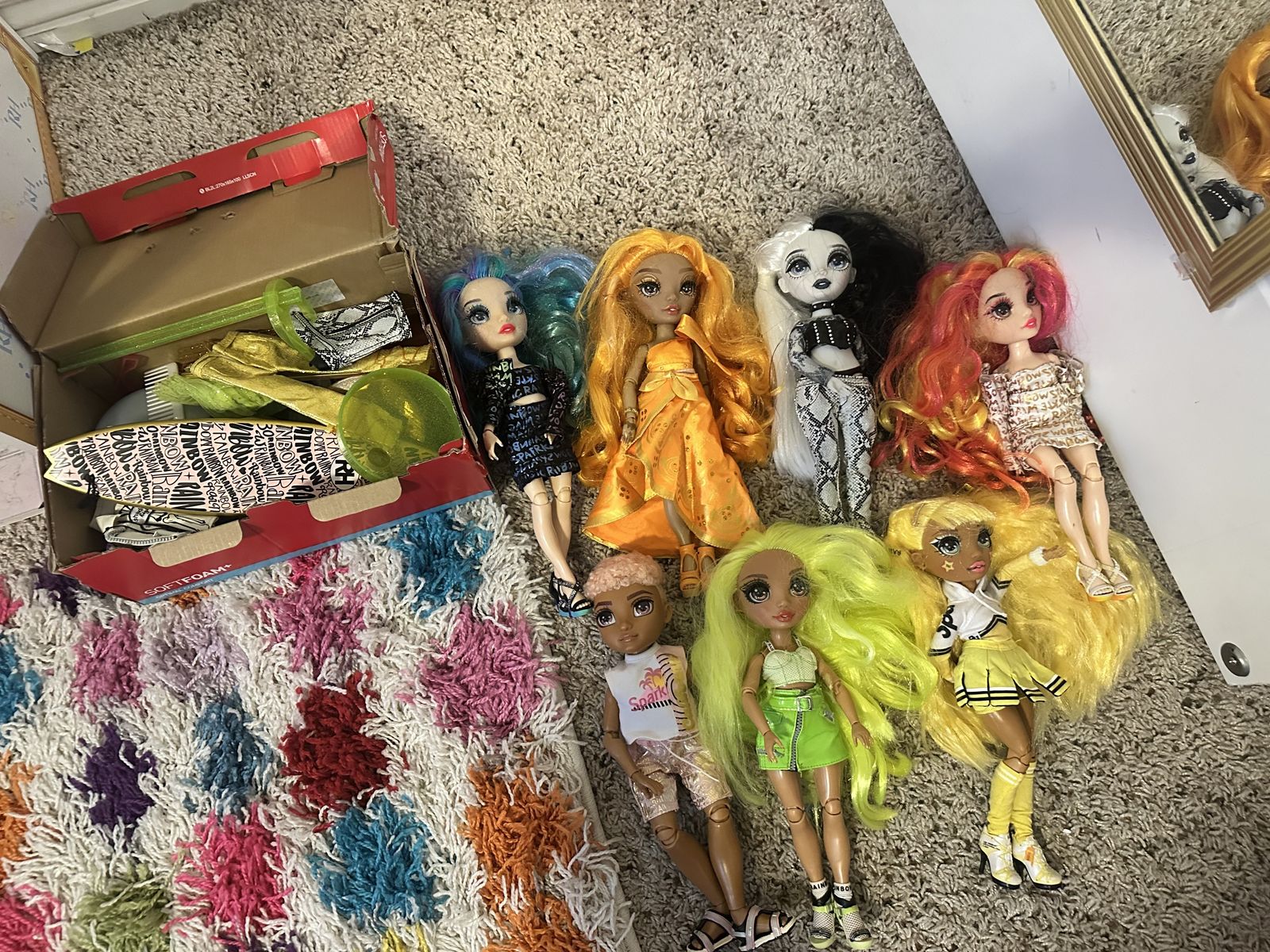 Venmo7 dolls and good condition doll house for rainbow high. Daughter doesn't use them but they are all in very nice condition.