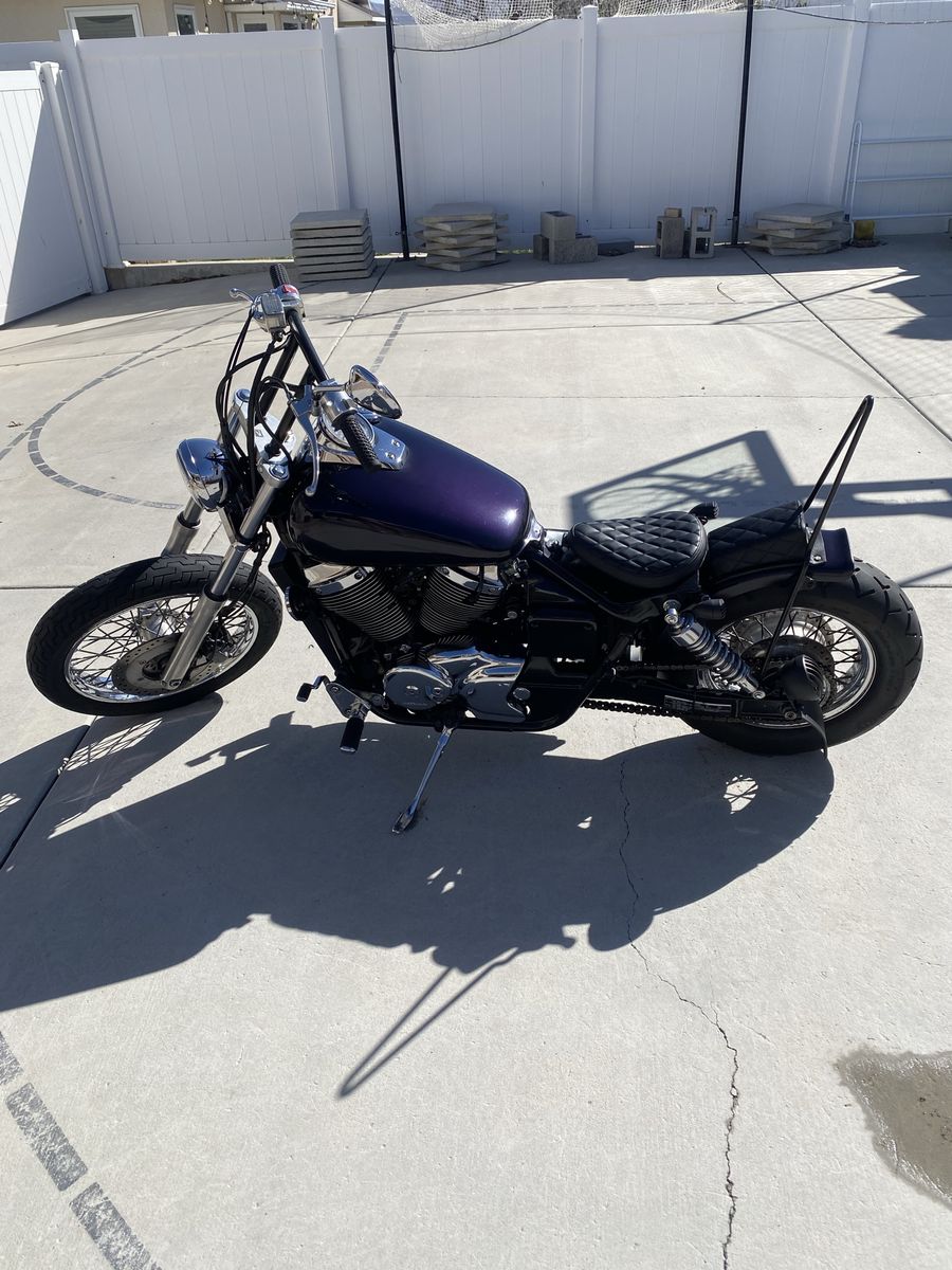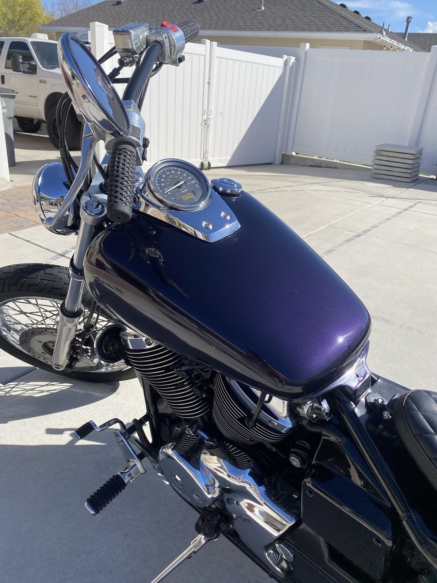 Looking to sell my custom 2006 Honda Shadow 750 Spirit. This bike has been professionally maintained and recently upgraded with high end aftermarket parts. The Build & Upgrades: • Paint: Fresh tinted purple pearl on gas tank and rear fender. • Handlebars: Brand new 10-inch TJ Brutal Customs T-Bars for a comfortable, aggressive stance. • Grips: Brand new Vans x Cult waffle grips. • Seating: Brand new diamond-stitched solo seat and matching pillion, mounted on a custom-fabricated seat pan. • Rear End: TJ Brutal Customs rear fender paired with a TC Bros sissy bar. • Lighting: Brand new front and rear turn signals. Includes a brand-new rear brake light with an integrated license plate bracket and LED light. Condition & Extras: • Stock Parts Included: I have a box with all original stock parts that were removed during the build. These go with the bike.