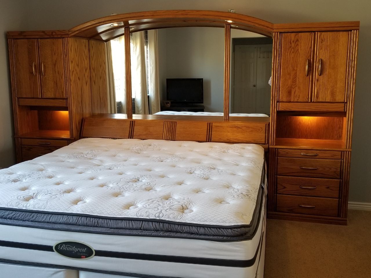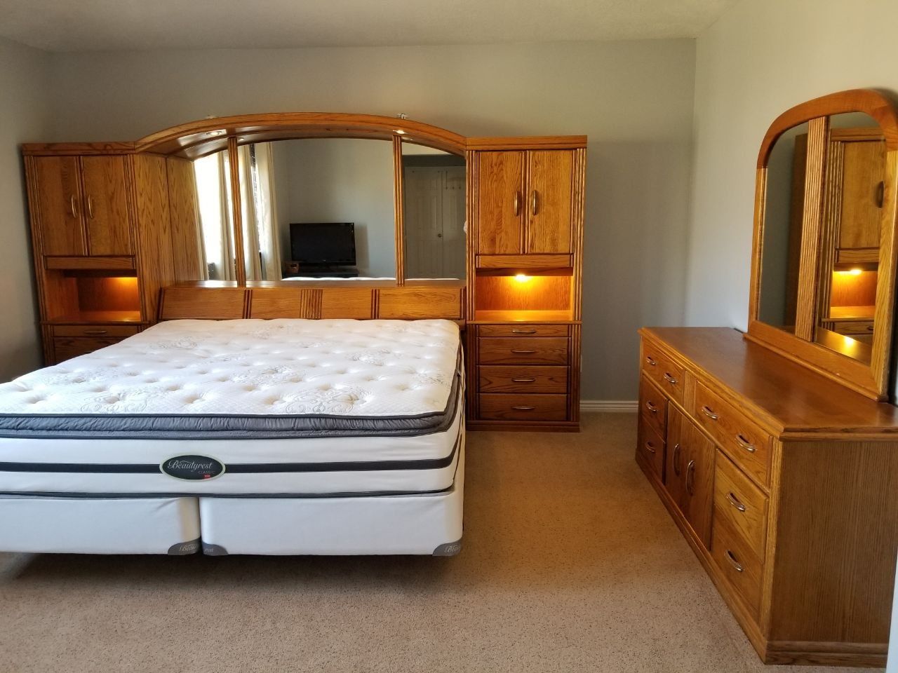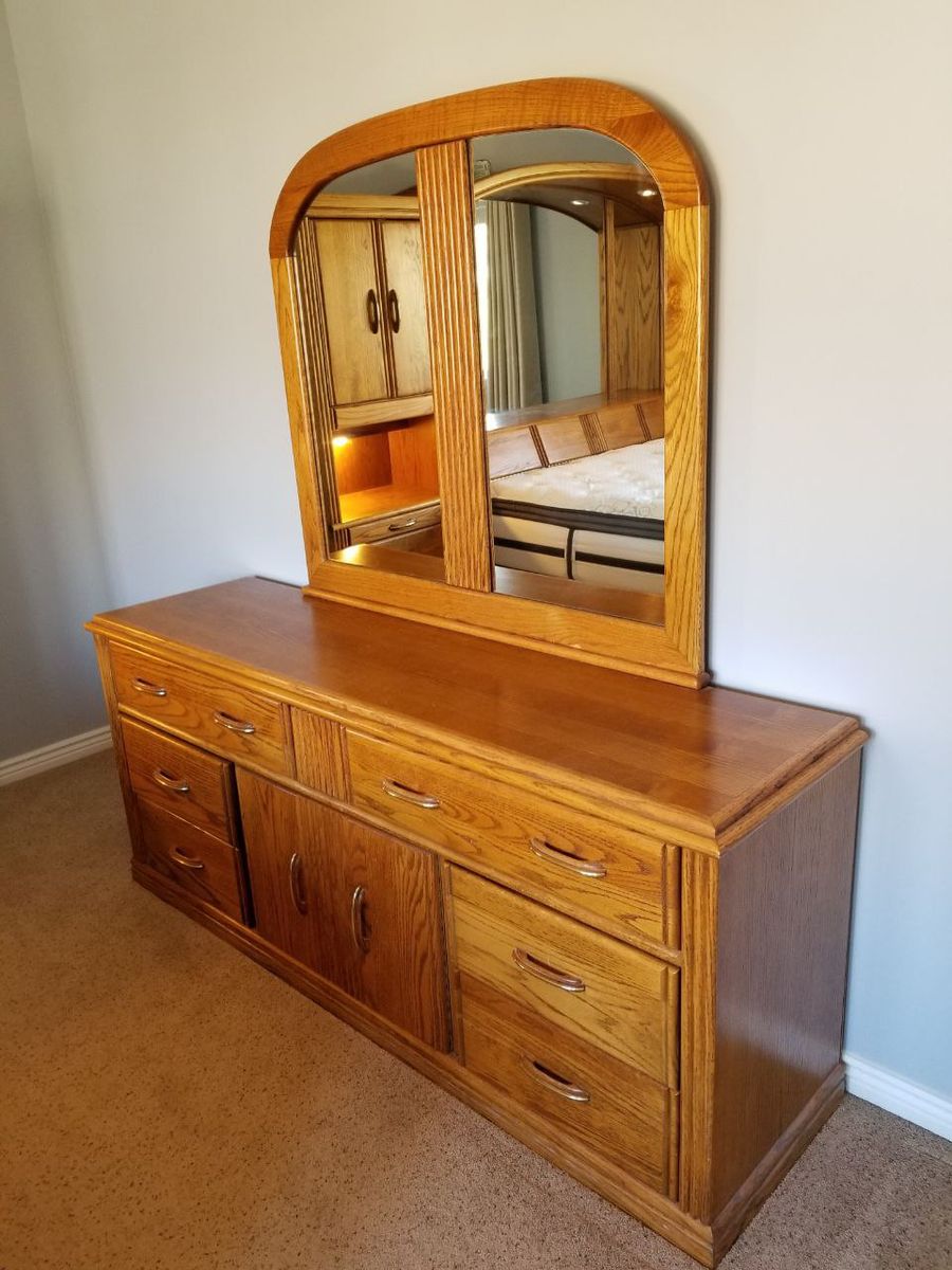 Large Matching Dresser: A massive 6-drawer dresser with a large center cabinet and a matching arched mirror. There are three hidden drawers in the dresser.