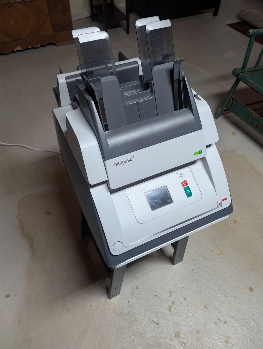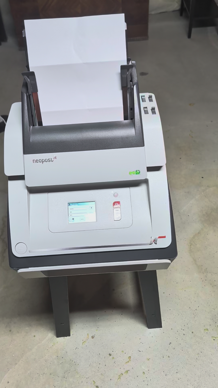 PayPalThe Neopost (now Quadient) DS-35 is a compact, user-friendly tabletop folder inserter designed for low-volume mail processing, handling up to 1,350 letters per hour. It features a color touch screen, 15 programmable jobs, and three feeders (two for documents, one for inserts/BRE) to automate folding and stuffing.