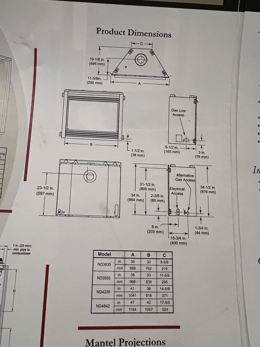 35" wide x 34 1/2 high Glass is 30" wide x 22" high • 40,000 BTU