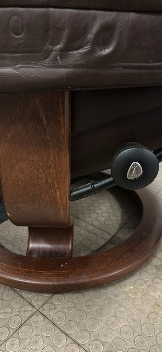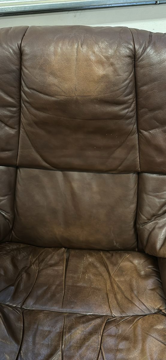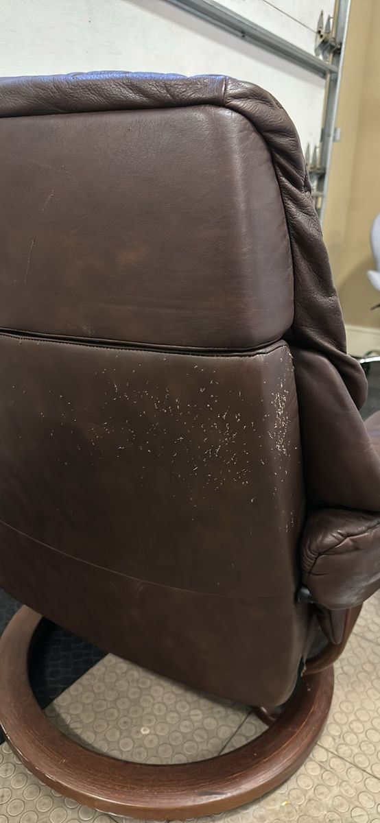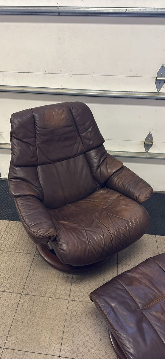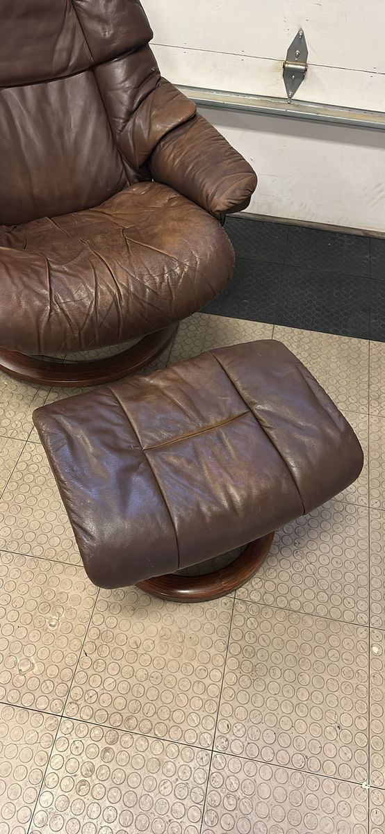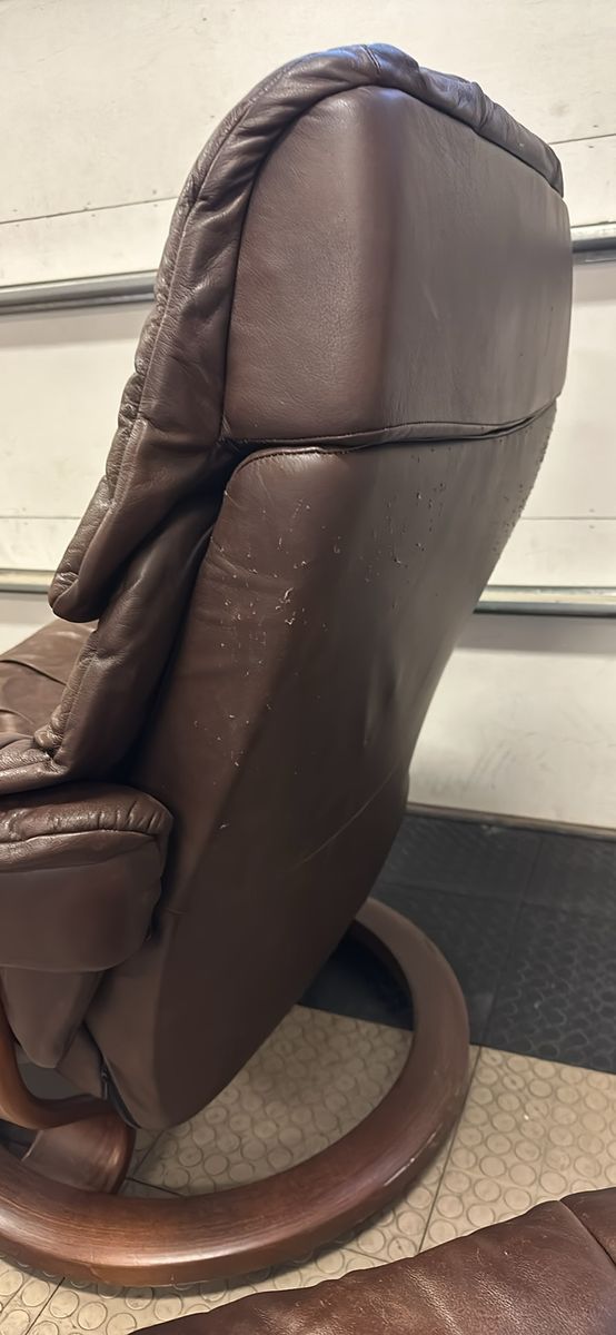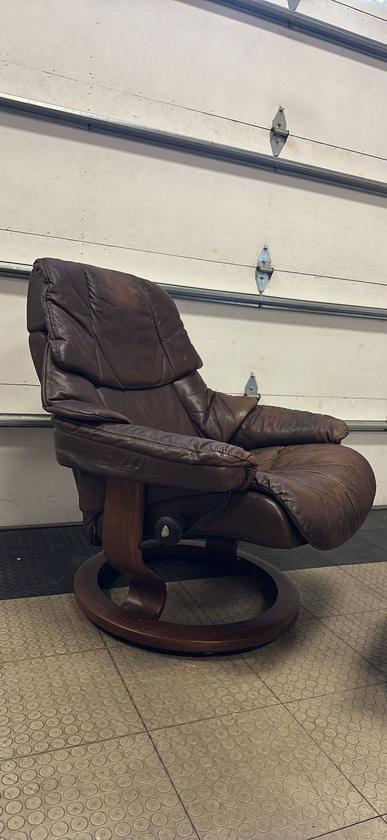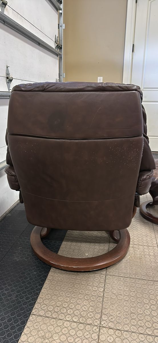 ZelleBeautiful brown Stressless Reno recliner and ottoman set by Ekornes. Has a little bit of cat love on the back unfortunately, and some fading to the leather from use. Very comfortable chair, I’m sad to see it go.