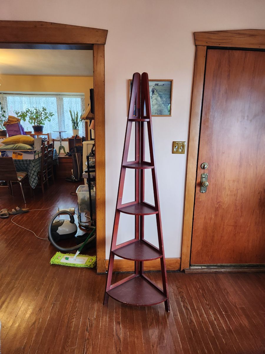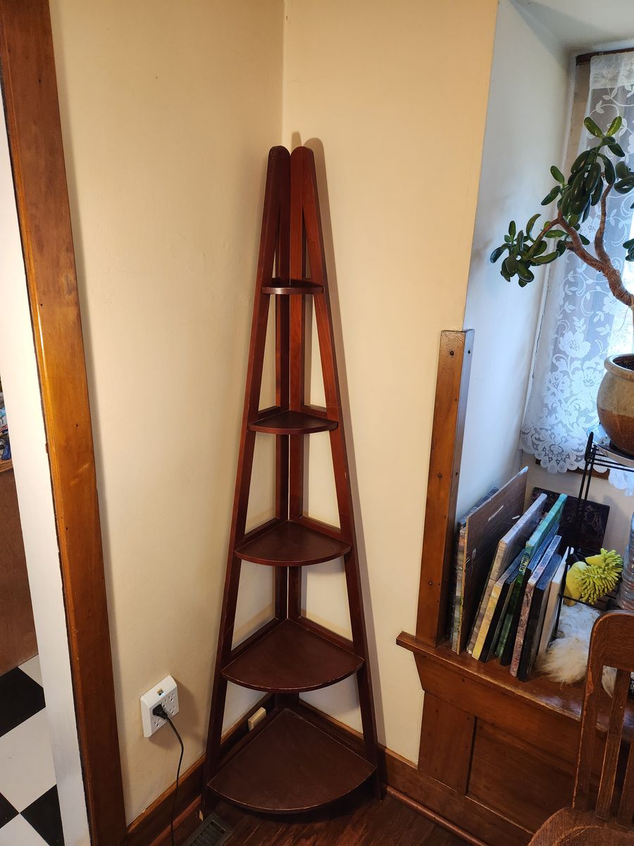 Wooden corner shelving. Four shelves. Sturdy and looks nice.