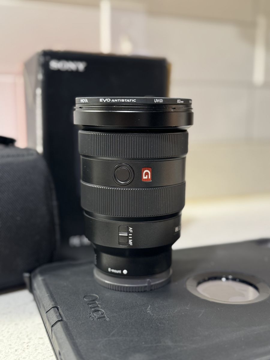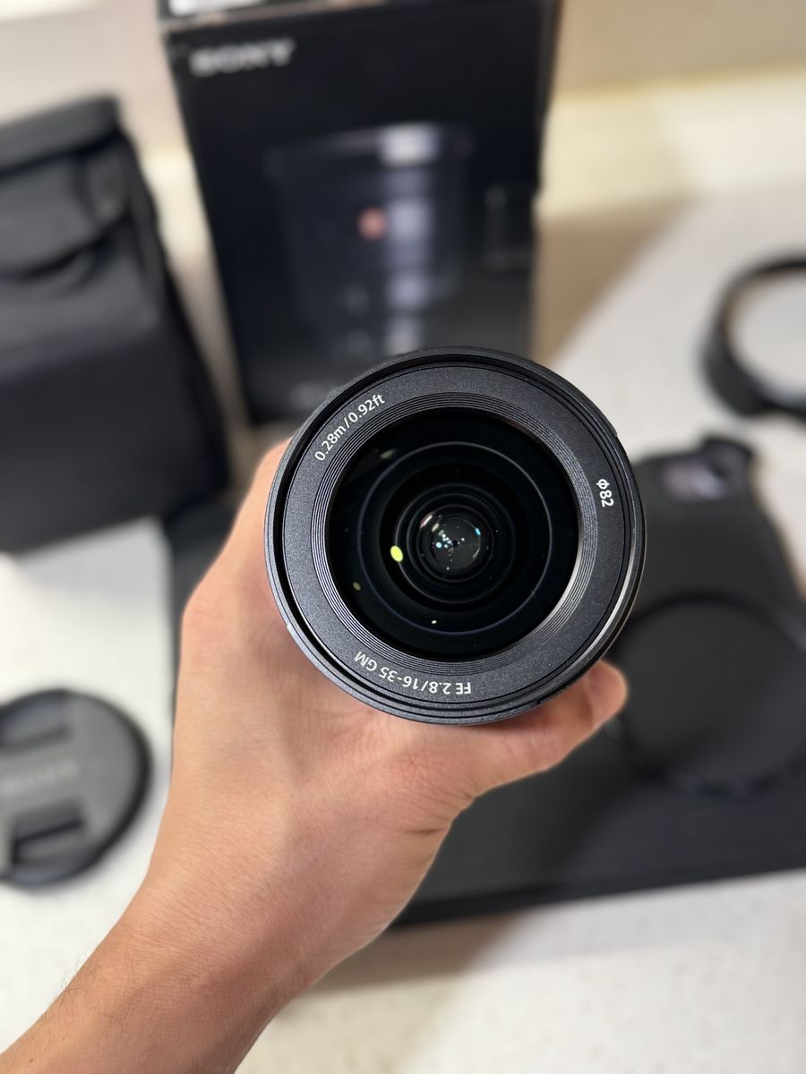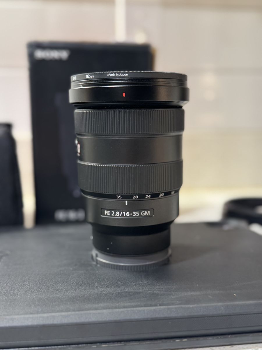 Near mint Sony FE 16-35mm F2.8GM. Has always had a Hoya EVO UV filter on to protect the natural lens underneath. Taken care of extremely well. Will come with the Hoya Evo antistatic UV filter as well. Original box and case included.