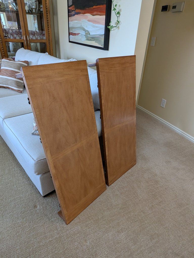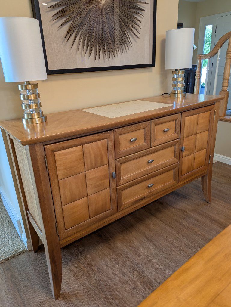 *Eldridge/Thomasville furniture *Table: 72" x 45" *2 leaves: each 18" wide *Sideboard: 60" Wide, 18" Deep, 36.5" High. Sideboard has storage for china and silverware. Plus extra storage. *4 Chairs: upholstery in pristine condition.