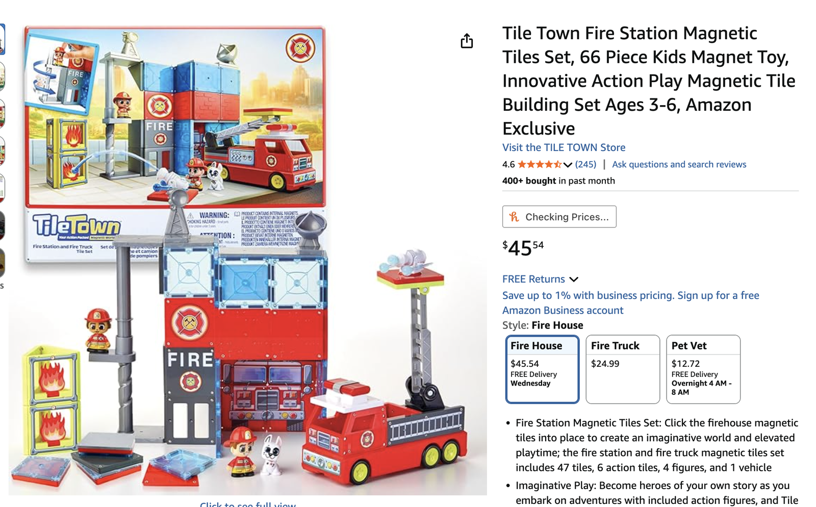 Fire Station Magnetic Tiles Set: Click the firehouse magnetic tiles into place to create an imaginative world and elevated playtime; the fire station and fire truck magnetic tiles set includes 47 tiles, 6 action tiles, 4 figures, and 1 vehicle