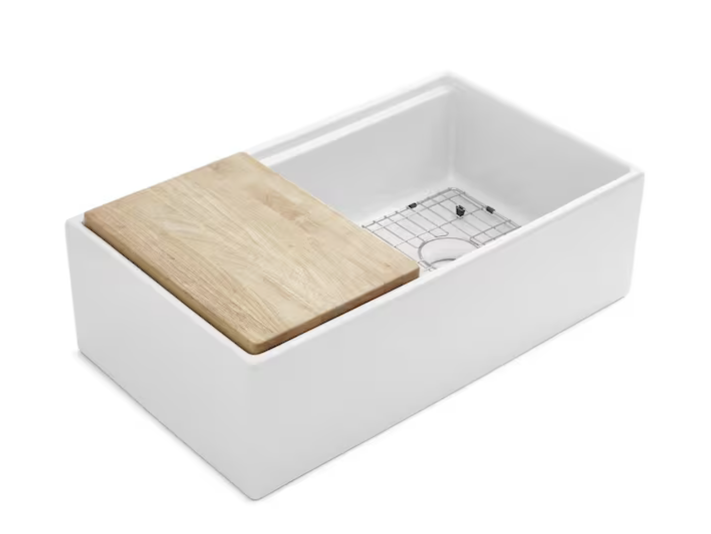 Dimensions: 33" x 19.25" x 10" Built-in ledge holds the sliding, solid wood cutting board in place Stainless steel bottom grid is dishwasher safe; removable rubber feet prevent scratches Sliding solid wood cutting board and stainless bottom grid