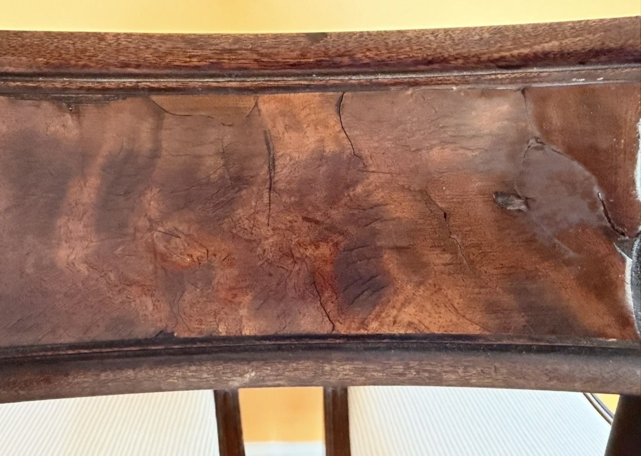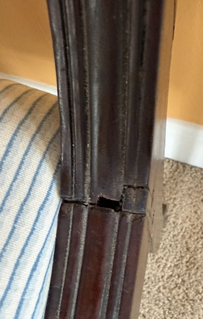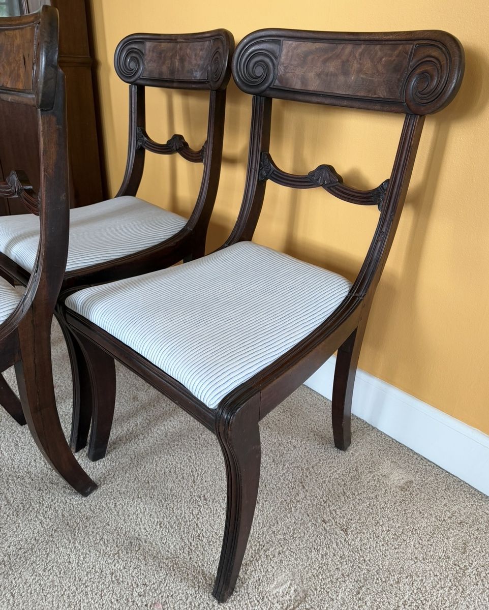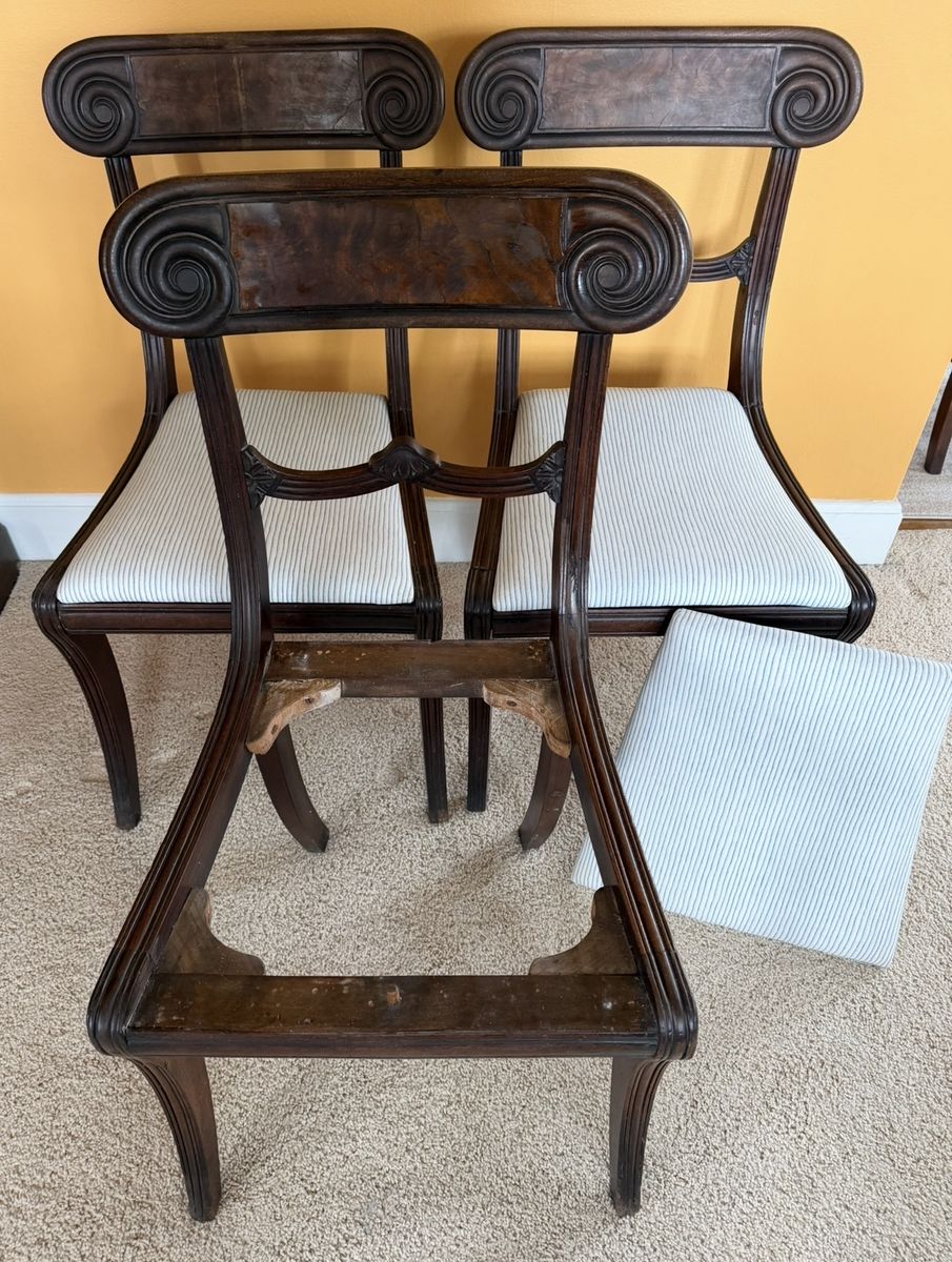 3 mahogany English chairs that were originally owned by my grandmother in the UK, but are likely older. They have removable seats, covered in unstained blue-and-white striped fabric. My guess is that the chairs are more than 100 years old, since my grandmother died about 30 years ago, when she was in her 90s. The chairs have wooden dowels holding them together, supplemented by metal flat-headed screws. I am unsure if the screws were used to repair the chairs, but my guess is that they were part of the original construction, likely in the mid 1800s. The chairs need repairs, with some loose joints, and chair panel damage. I am only selling them because I am moving overseas. I will take $75 cash for the three chairs, and would like to sell them as a set since they match. No bargaining.