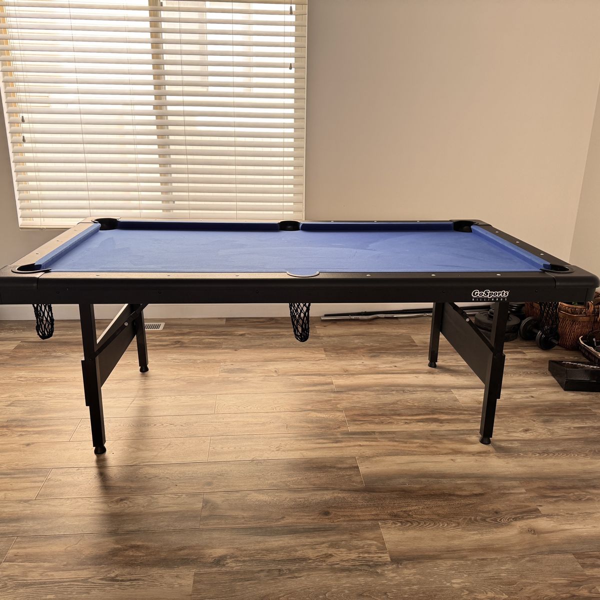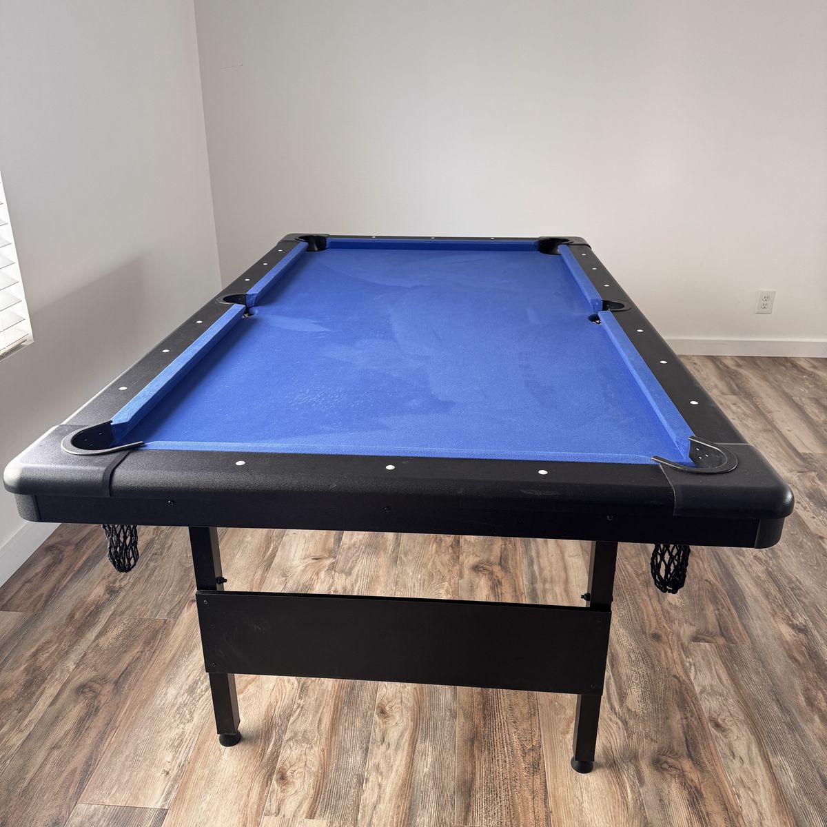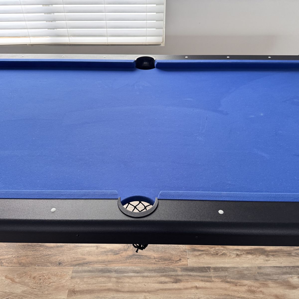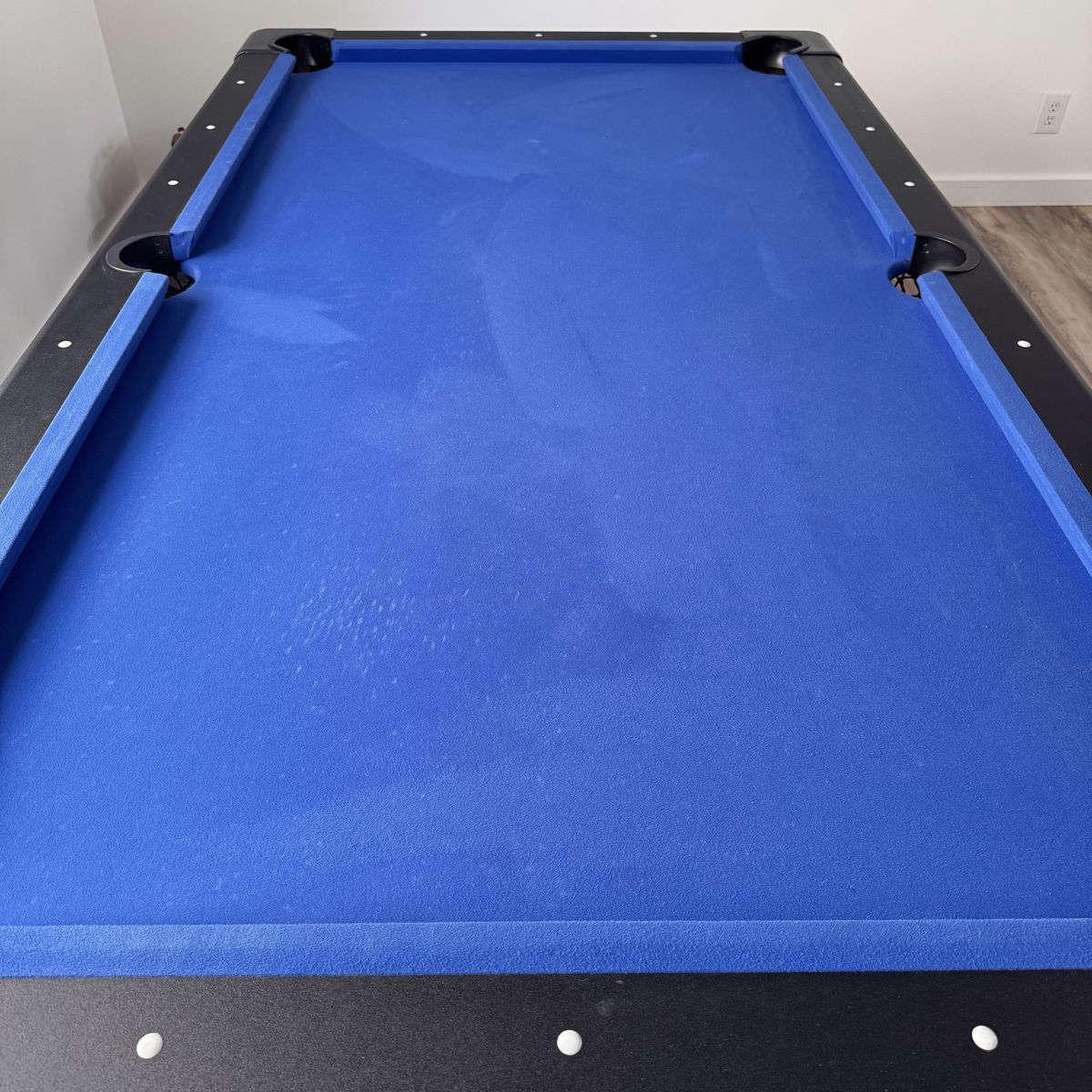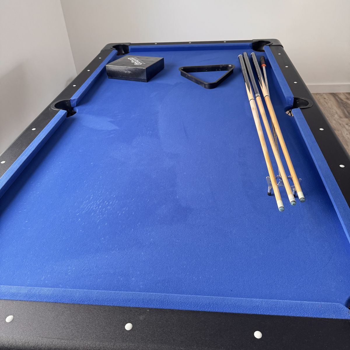 Black and blue pool table, in excellent conditions. Minimal wear. Includes a mid-size billiards table with 15 regulation balls and cue ball, ball rack, 2 57 inch cue sticks, felt brush. 84 L x 47 W x 31 H inches Perfect for game rooms, apartments, offices. Heavy-duty steel frame keeps the table sturdy and the premium felt surface ensures smooth gameplay. It can be put away by folding the legs out. RECOMMENDED ROOM SIZE: 13 ft x 16 ft