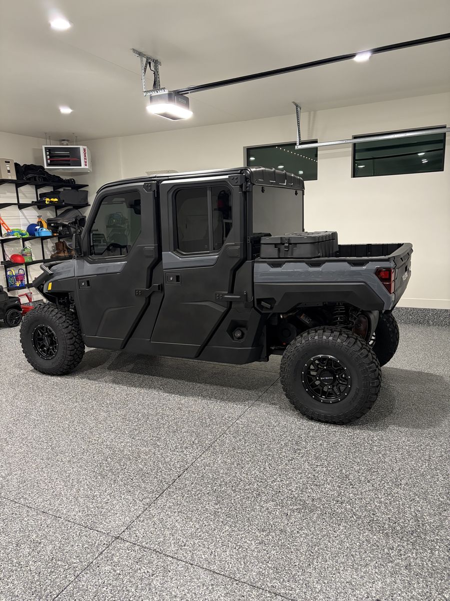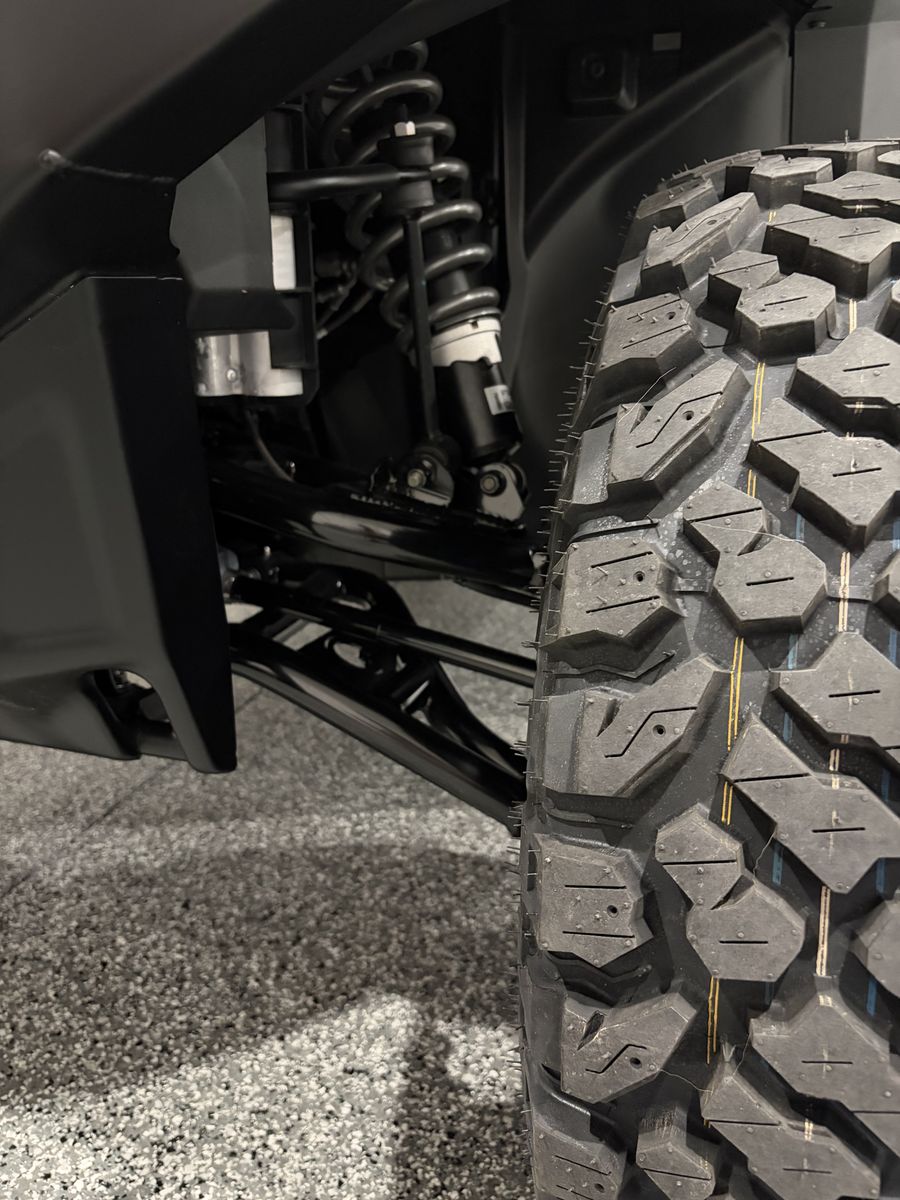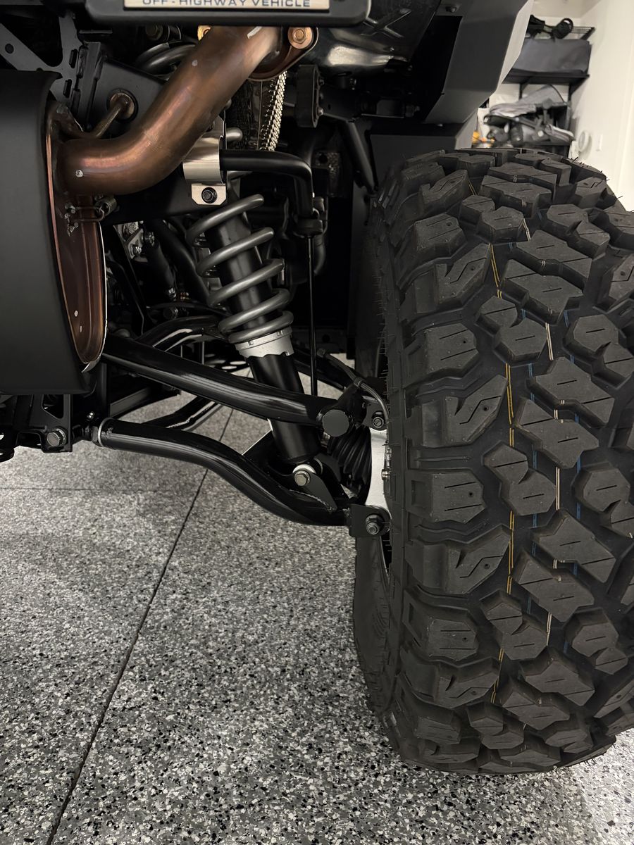Polaris side mirrors, Polaris bed matt, Polaris lock and ride cargo box, Polaris bumper lights, Polaris brush guard, front and rear SUPERATV forward A-arms. Raceline wheels and Kenda 30 inch tires