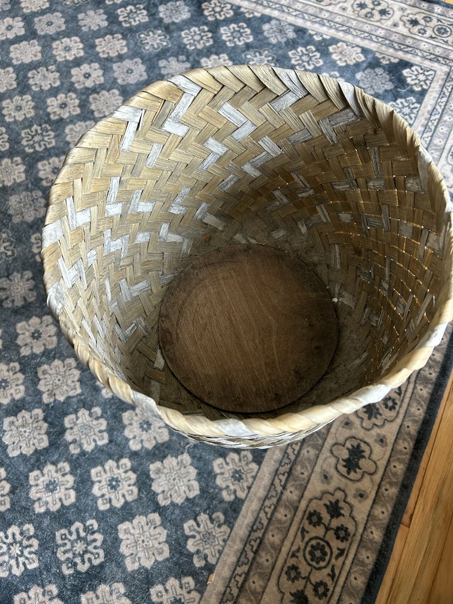 ZellePlant stand with wooden legs. Woven wood basket. Basket is 12” round / 10” deep Total height is 22”