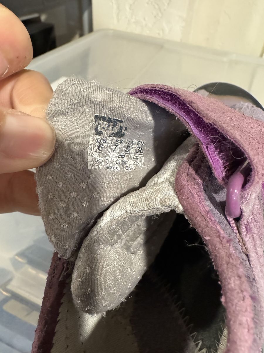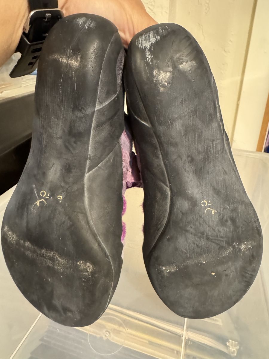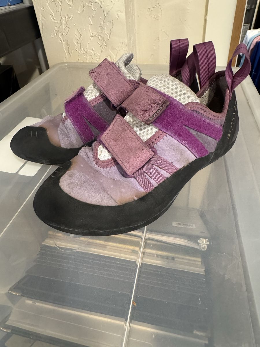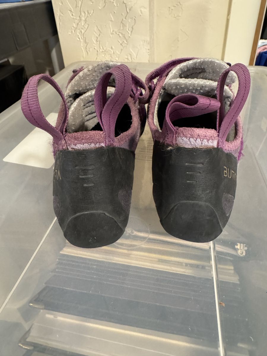 Butora Endeavor women climbing shoes. We got this for my daughter in used condition for $35 plus tax. She used them between the ages of 7.5 through 9. No holes or rips