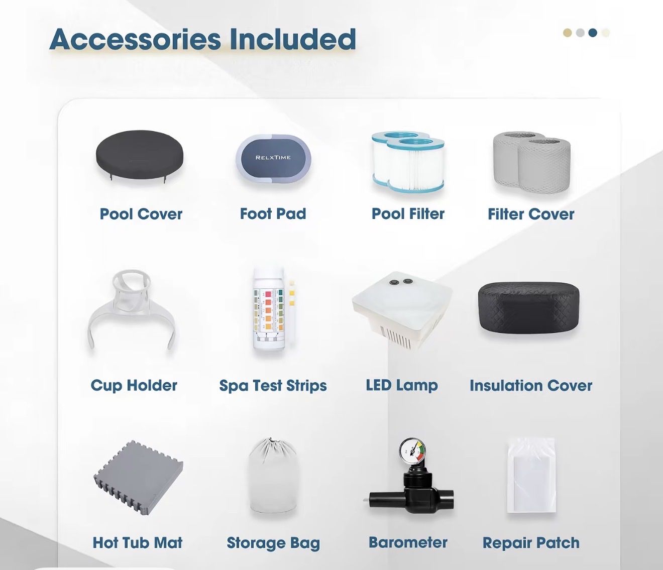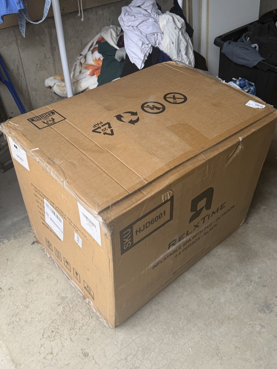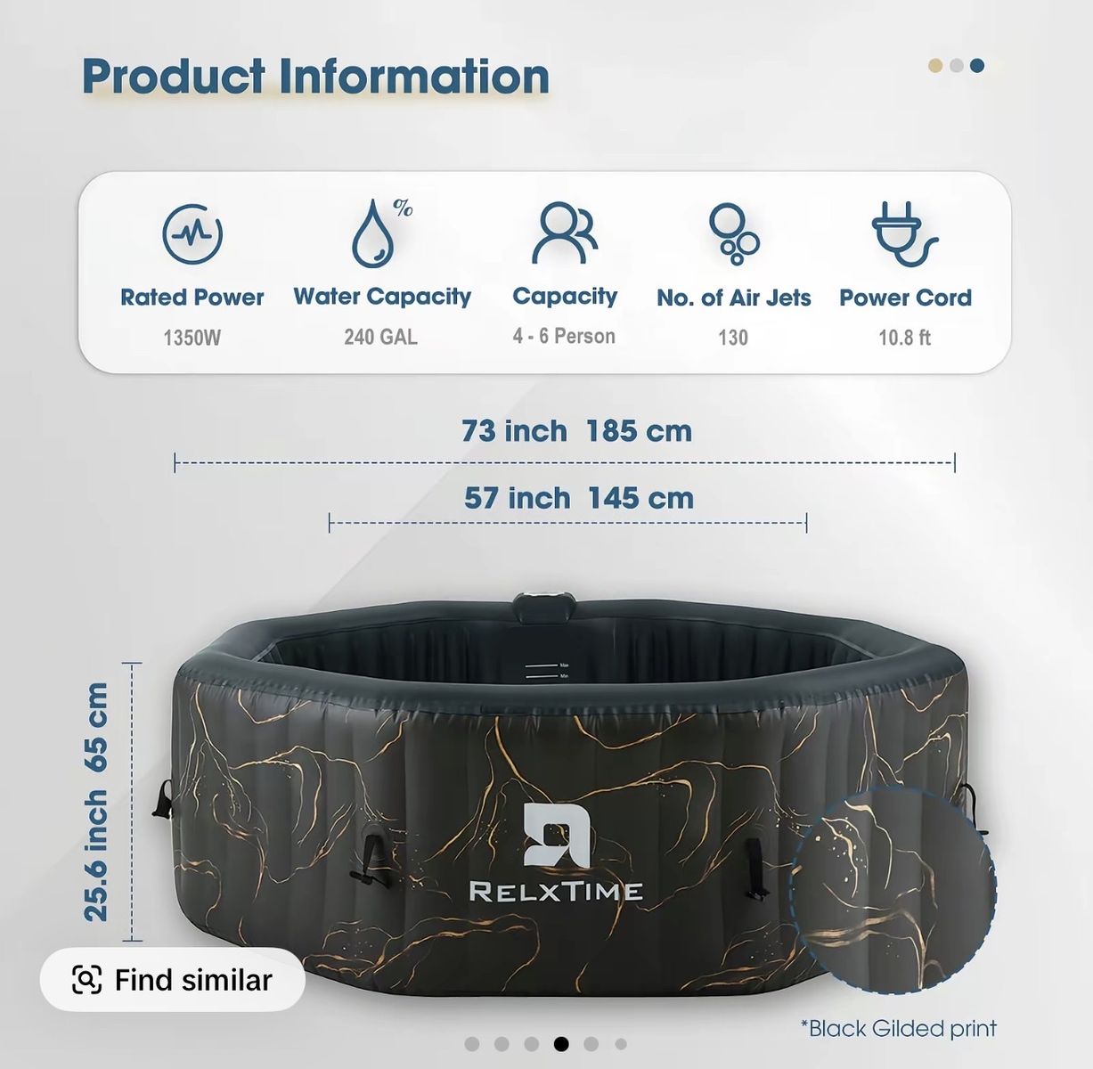 VenmoBrand new RELXTIME hot tub, still in box. Decided to go with something else after ordering this one. Has 4-6 person capacity, octagonal shape, and cool black gilded print. Comes with 130 soothing bubble jets. Water capacity 240 gallons. Power cord is 10.8 ft. Dimensions are 73 x 57 x 25.6 inches (185 x 145 x 65 cm). Full set of accessories included: pool cover, foot pad, pool filter, filter cover, cup holder, spa test strips, LED lamp, insulation cover, hot tub mat, storage bag, barometer, and repair patch. See Less
