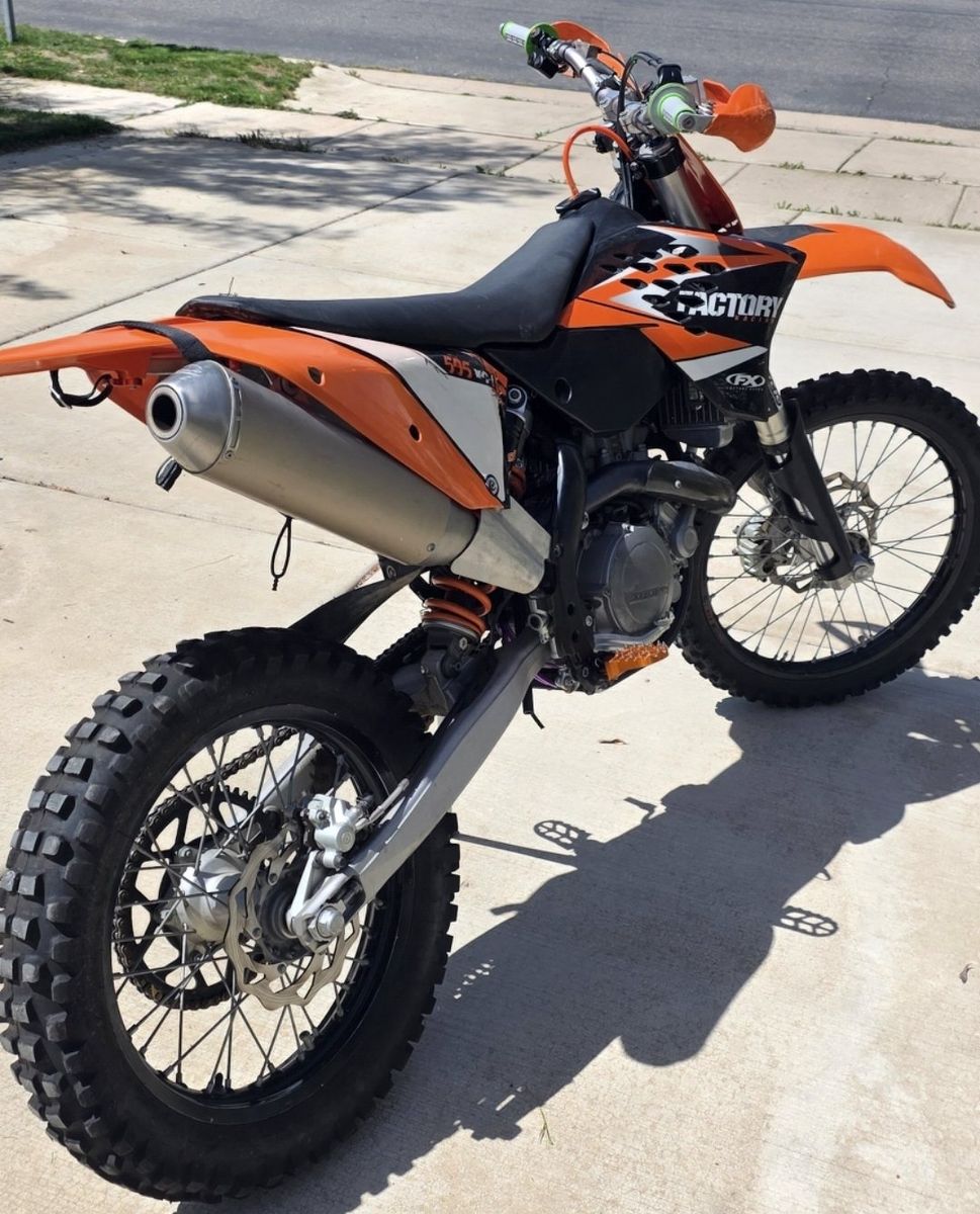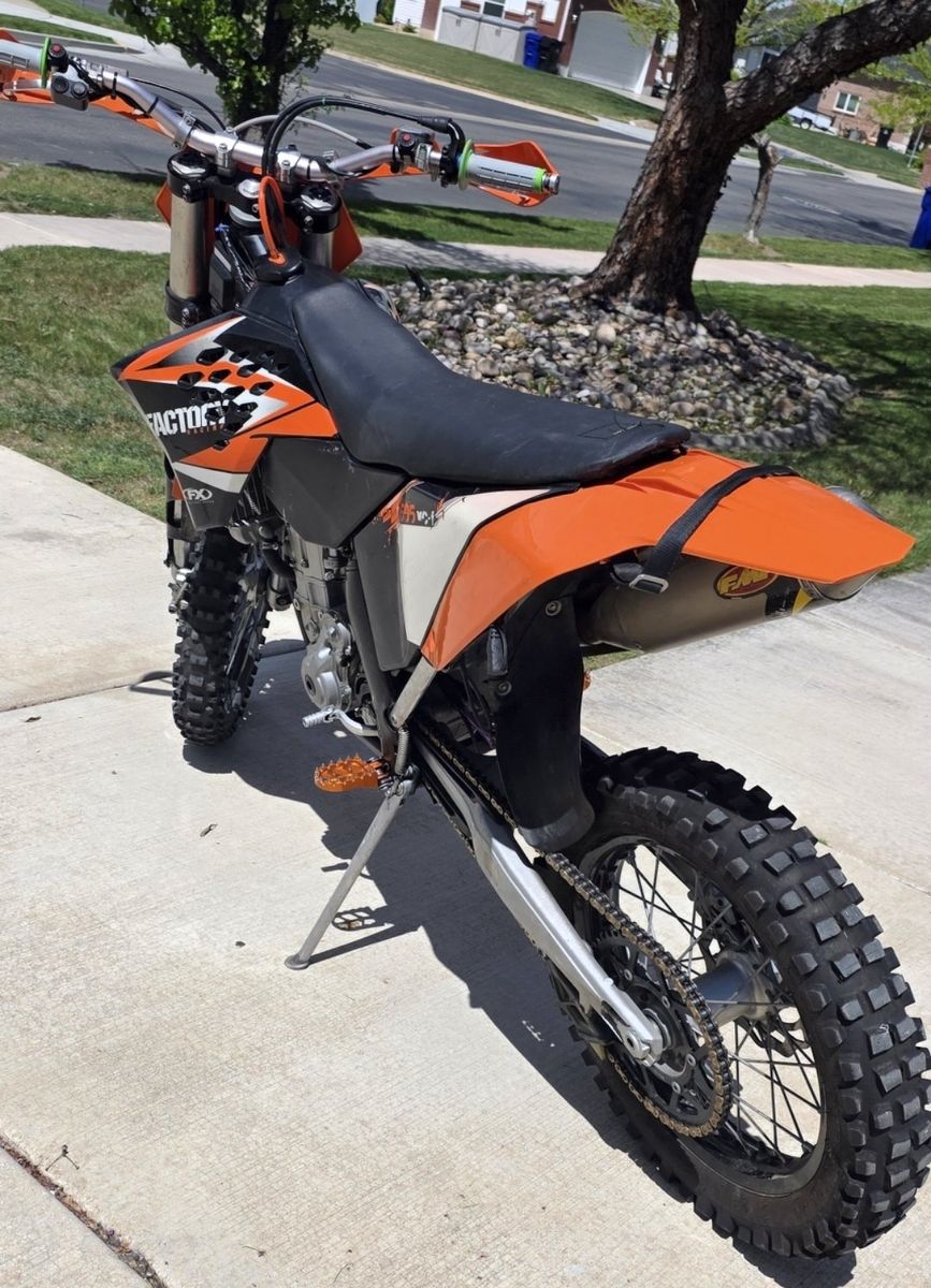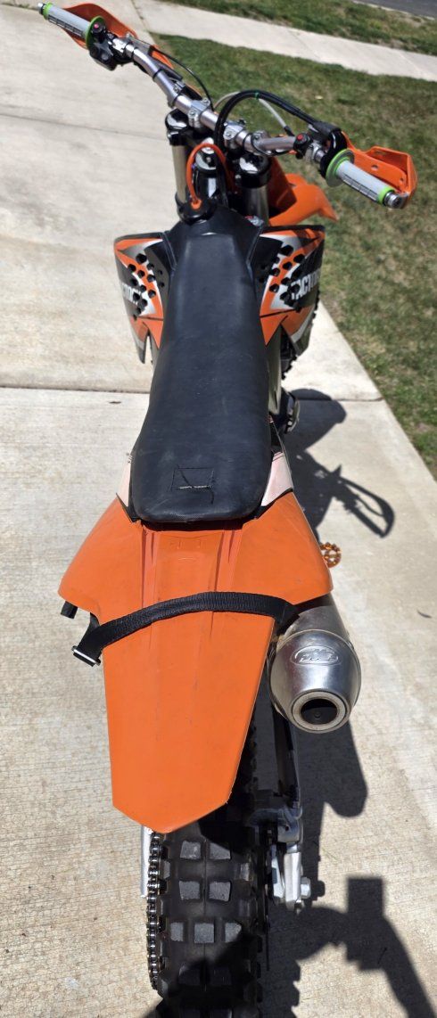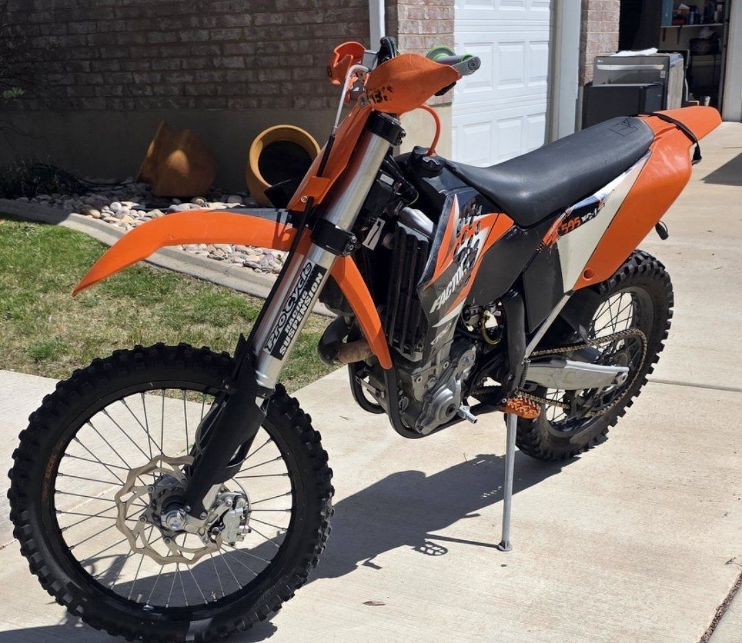 2009 KTM 505xcf -Fresh Top End (will provide piston that came out for reference to show it was still solid), had blow-by due to small piece if debris causing ring to stick a little so bought new top end kit and replaced anyway. Old piston/rings, etc are still good after clearing debris! -Replaced Exhaust Camshaft with newer superseded 2011 KTM exhaust Cam as original was rounding off causing issues with decomp. (Will provide Original) -Procycle Suspension set up for 200lbs -Wired for Lights but currently no lights on it as I moved my setup to another bike. -New air filter, grips, plus some extra replacement parts like brake pads, newer lithium battery. -FMF Silencer w/ spark arrestor -Wired Efan with thermostat -Bark Busters -Dual switch on bars for Lights and to switch between mapping.
