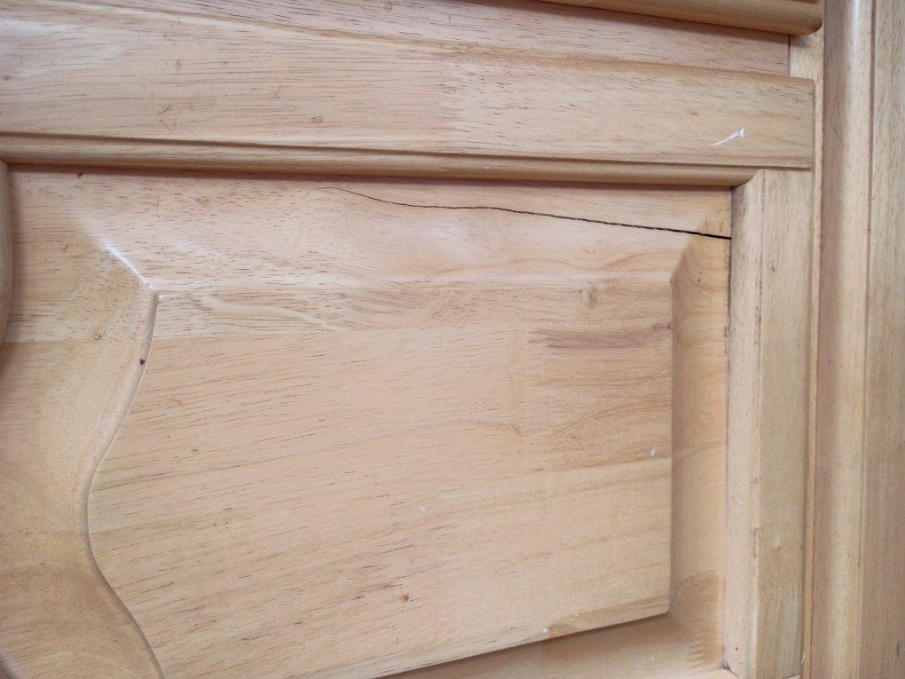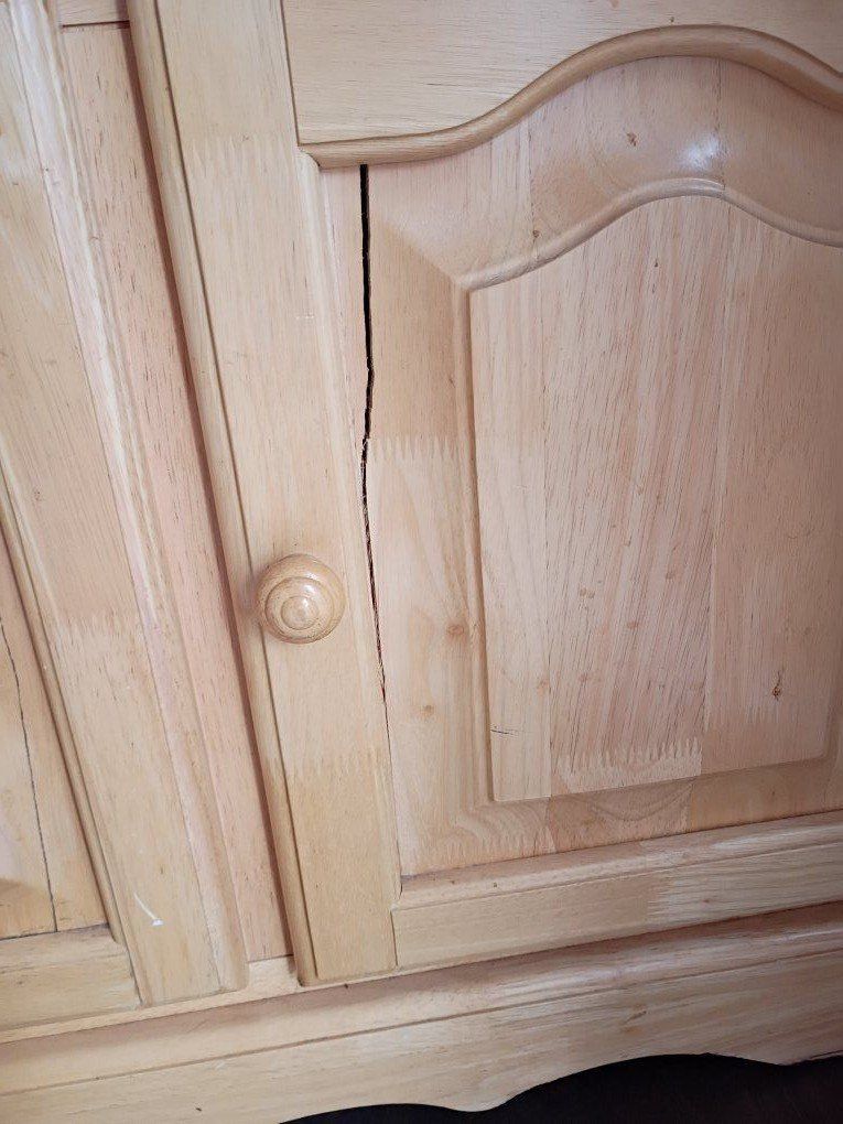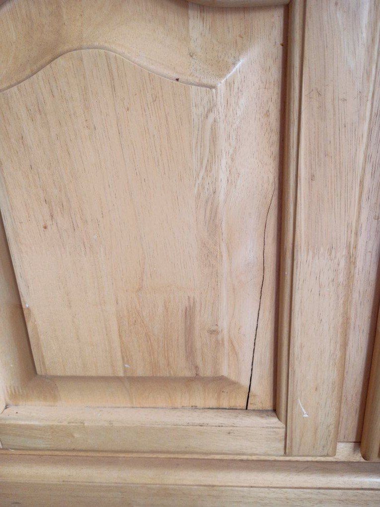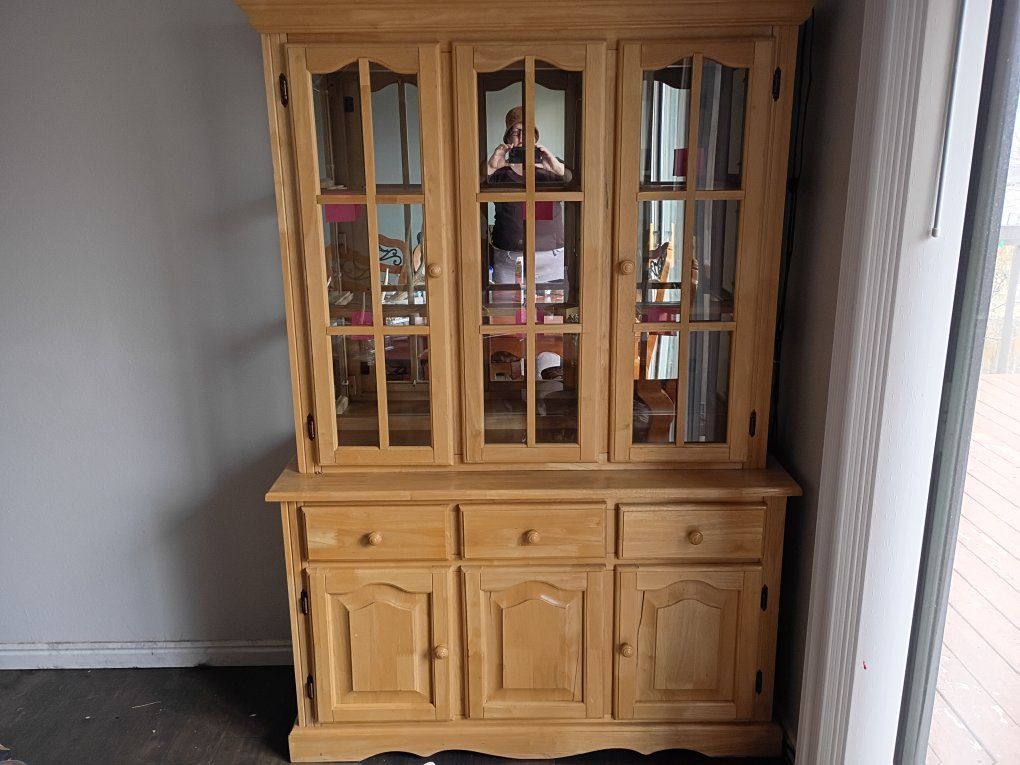 Light wood, I bought this with the cracks, they haven't gotten any wider or bigger. It does come with glass shelves. has 2 lights on the top.