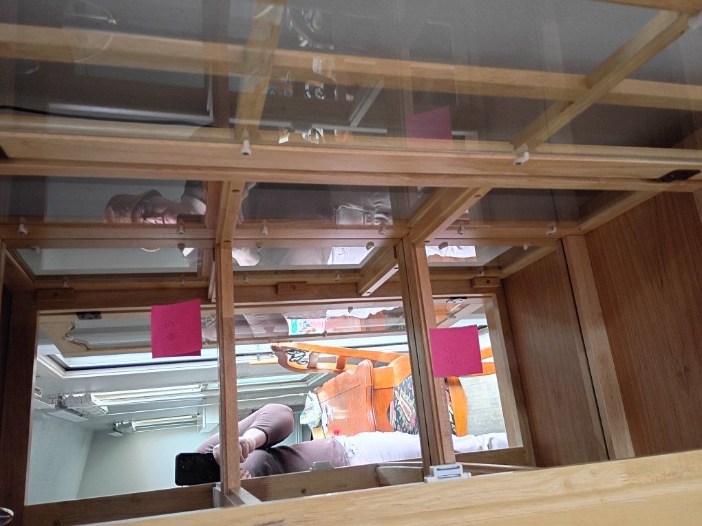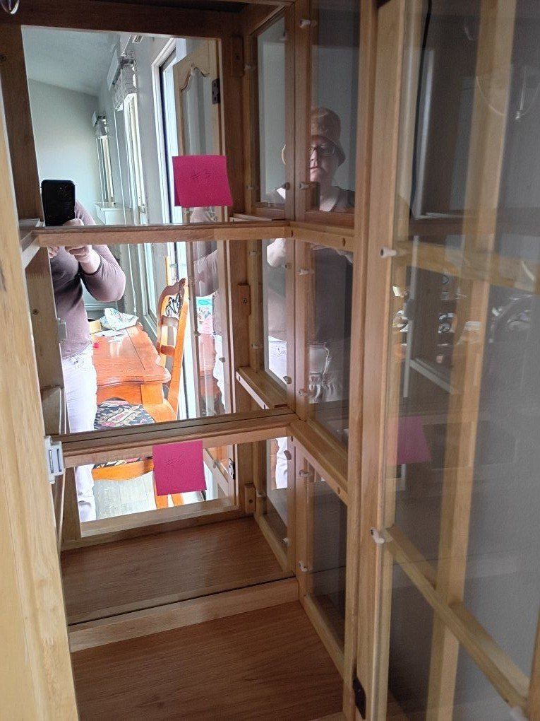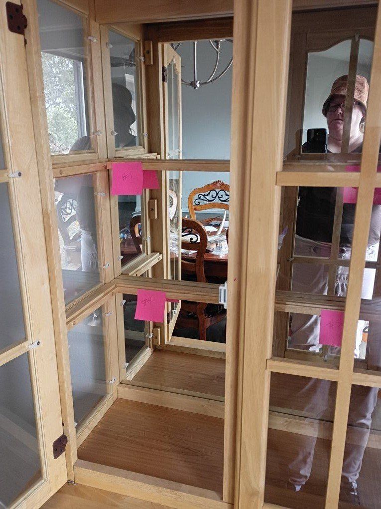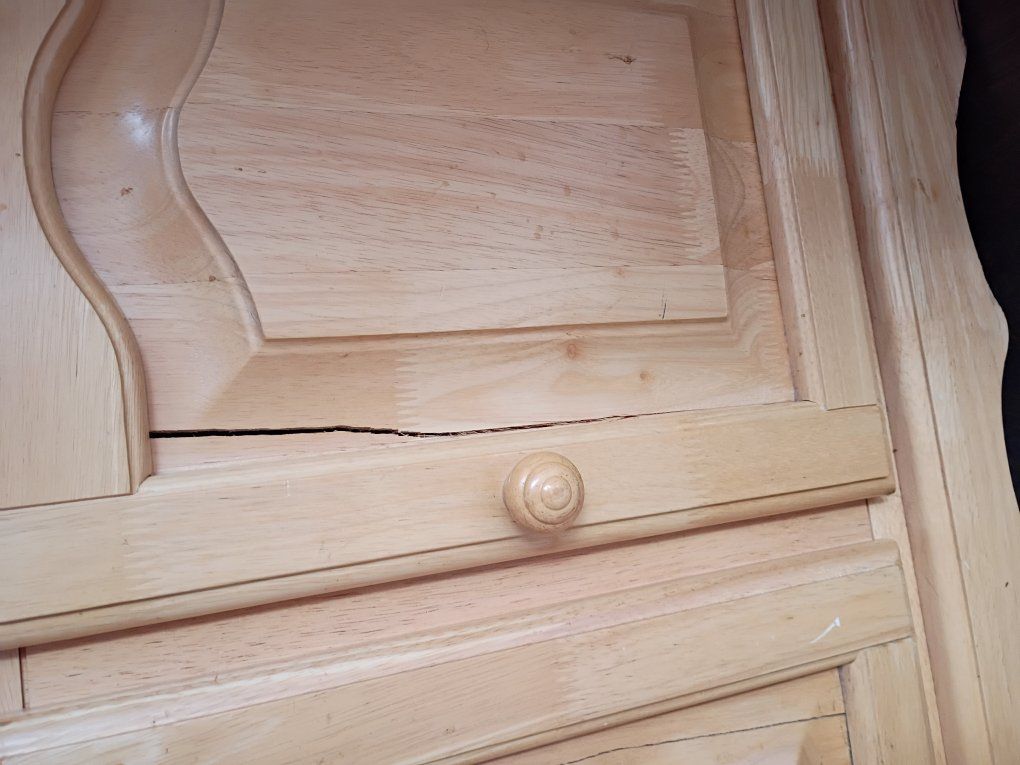 Light wood, I bought this with the cracks, they haven't gotten any wider or bigger. It does come with glass shelves. has 2 lights on the top.
