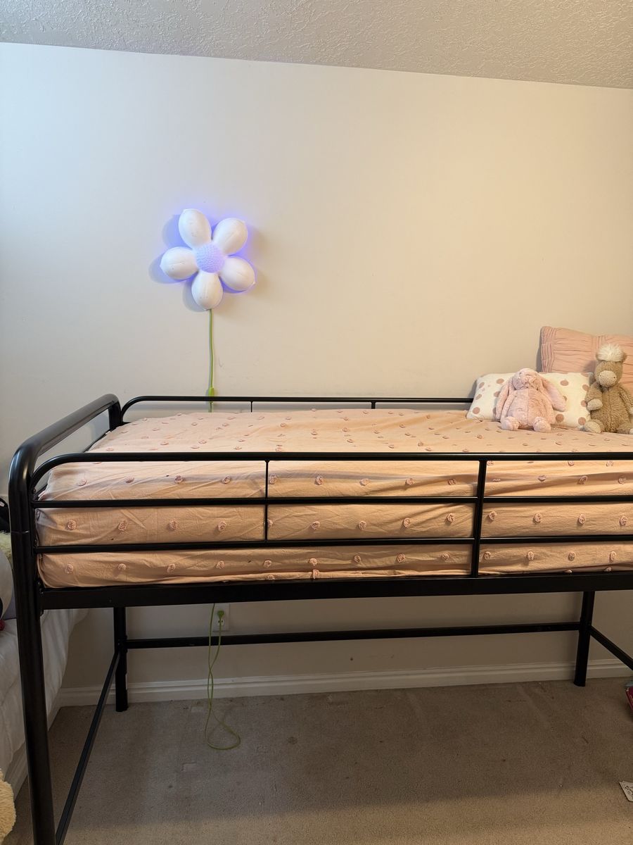 ApplePayThis is a steal! Standard twin bed. From the floor to the bottom of the bed is 36”. The top to the rail is 49”. We are selling the frame it’s self for $25. If you need a good mattress you can buy the combo for $50.