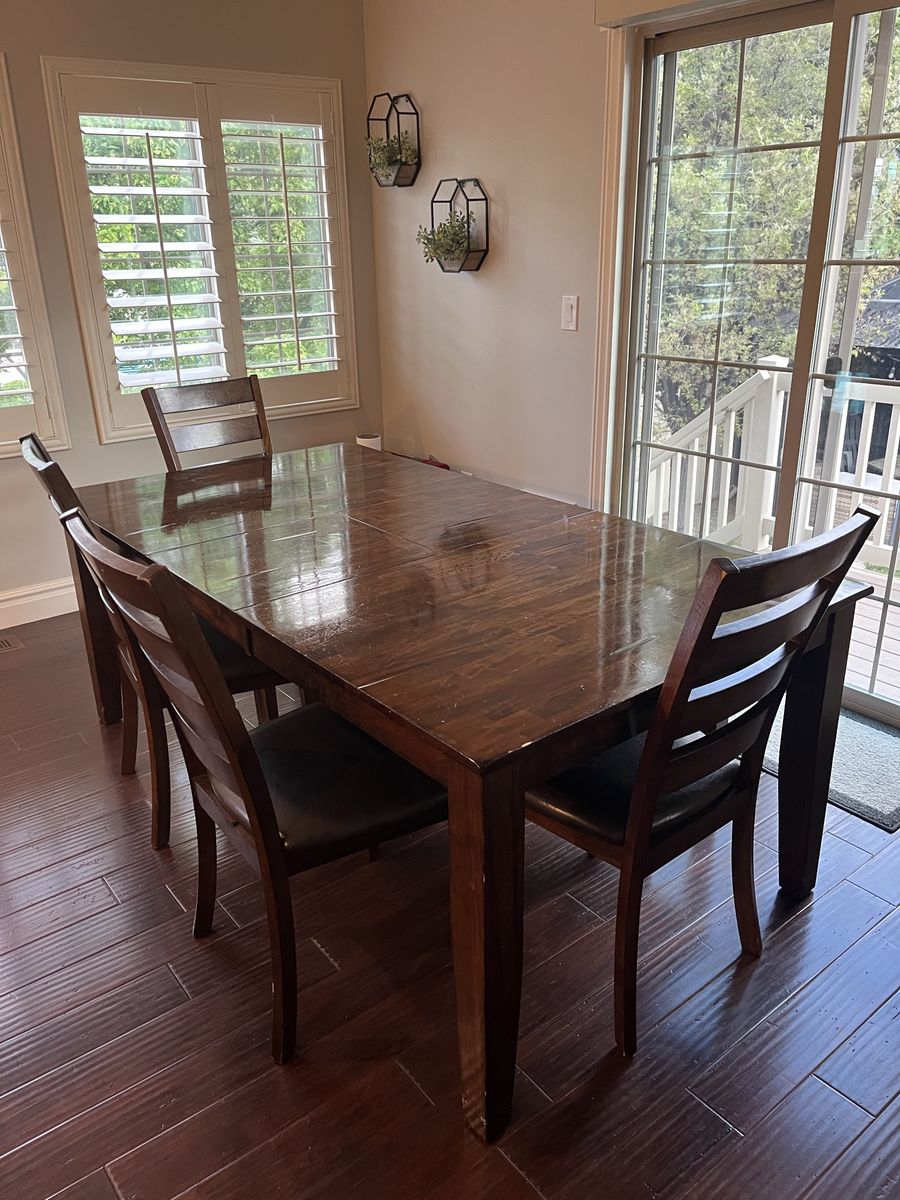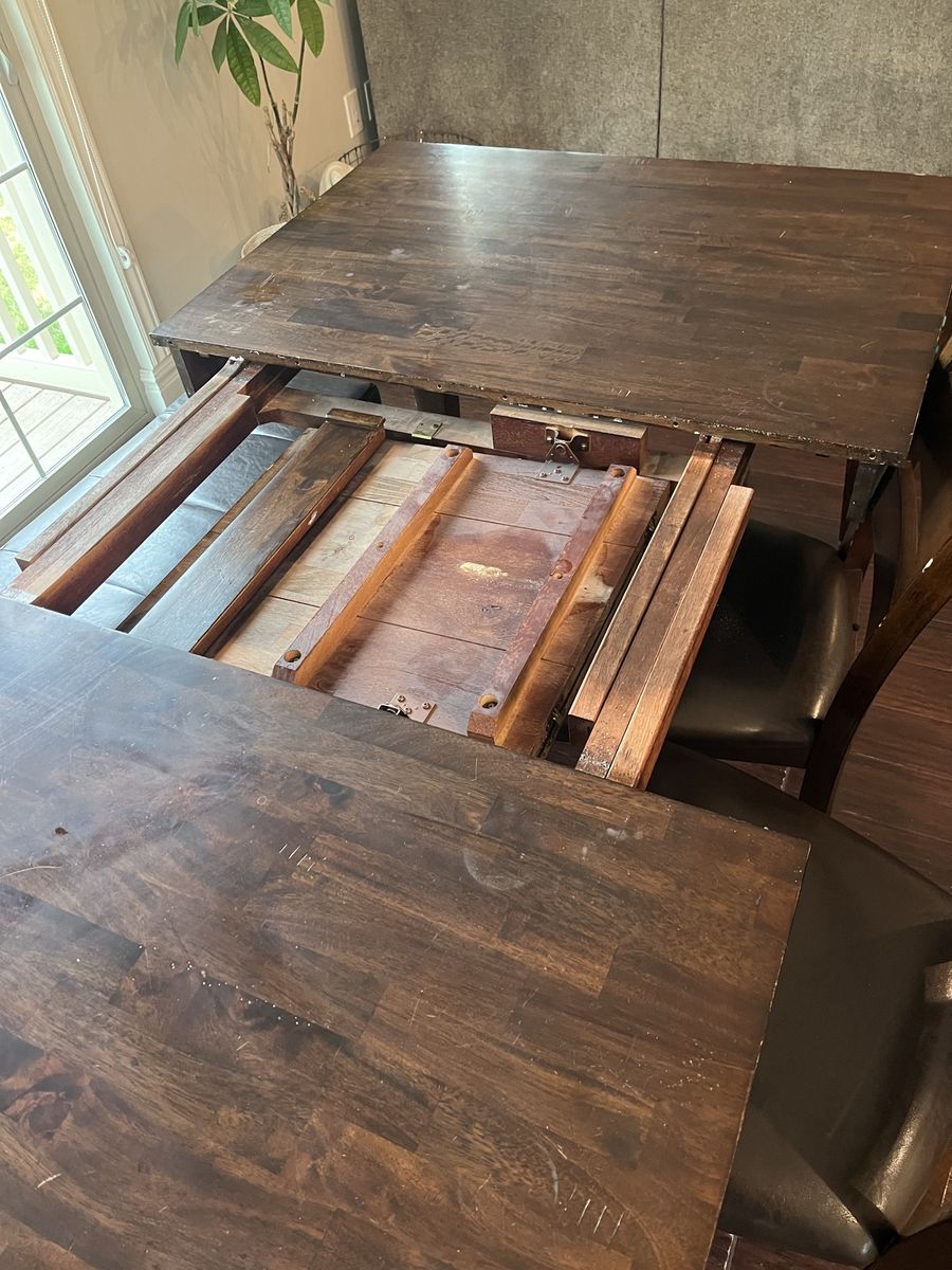 VenmoTable, 4 chairs and bench are included. Beautiful mango wood with butterfly stow away extension leaf. We have loved this table. Does it show a few surface signs of wear? Yep. But still lovely and sturdy. Dimensions: 78”x42”x30” OR 60”x42”x30”.