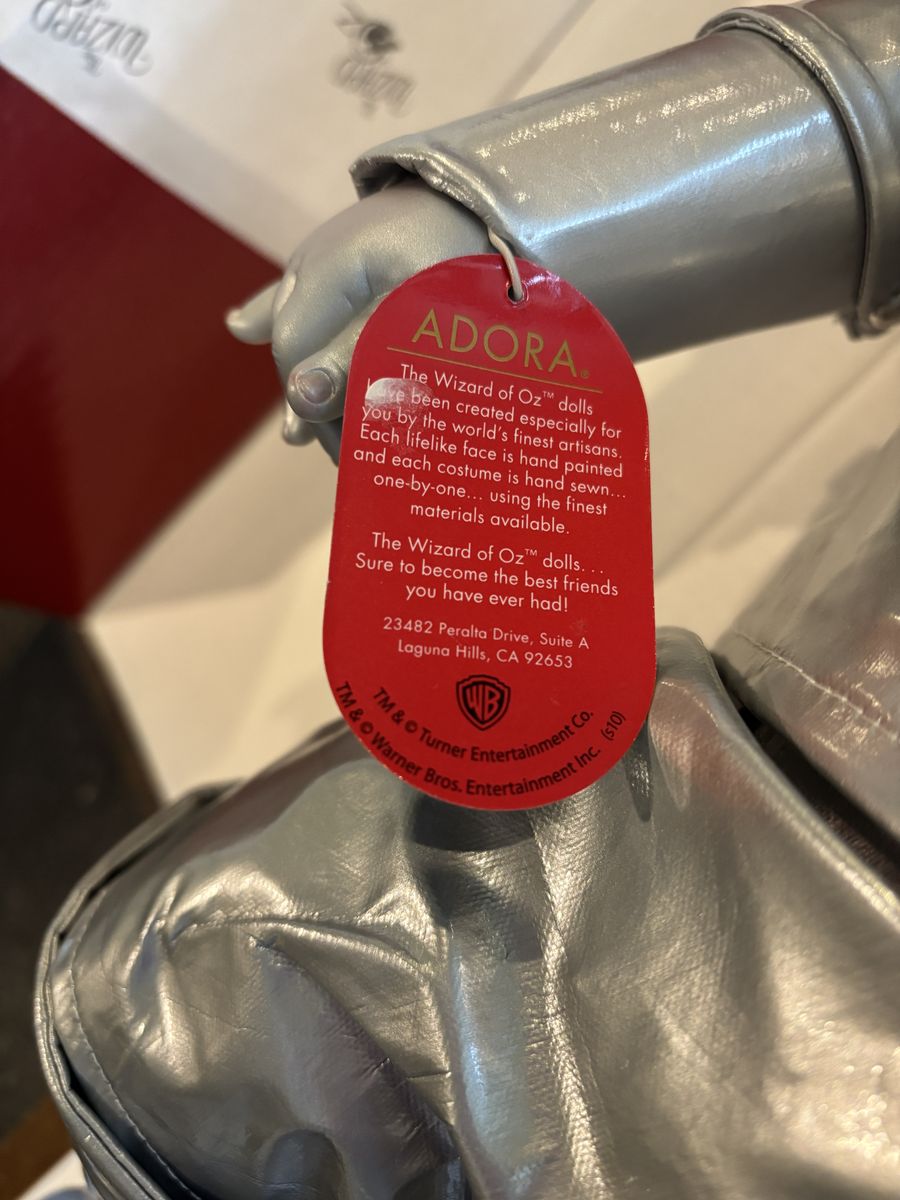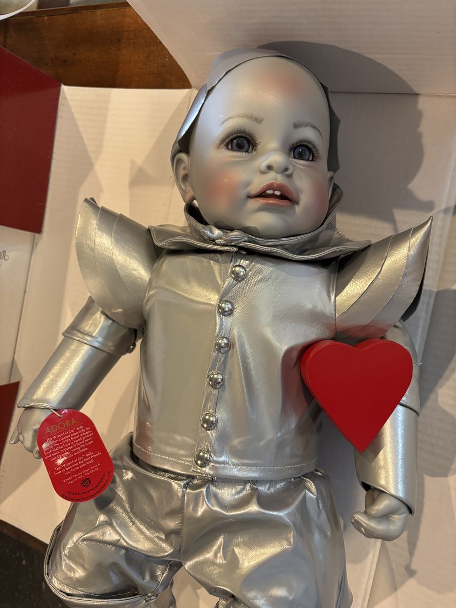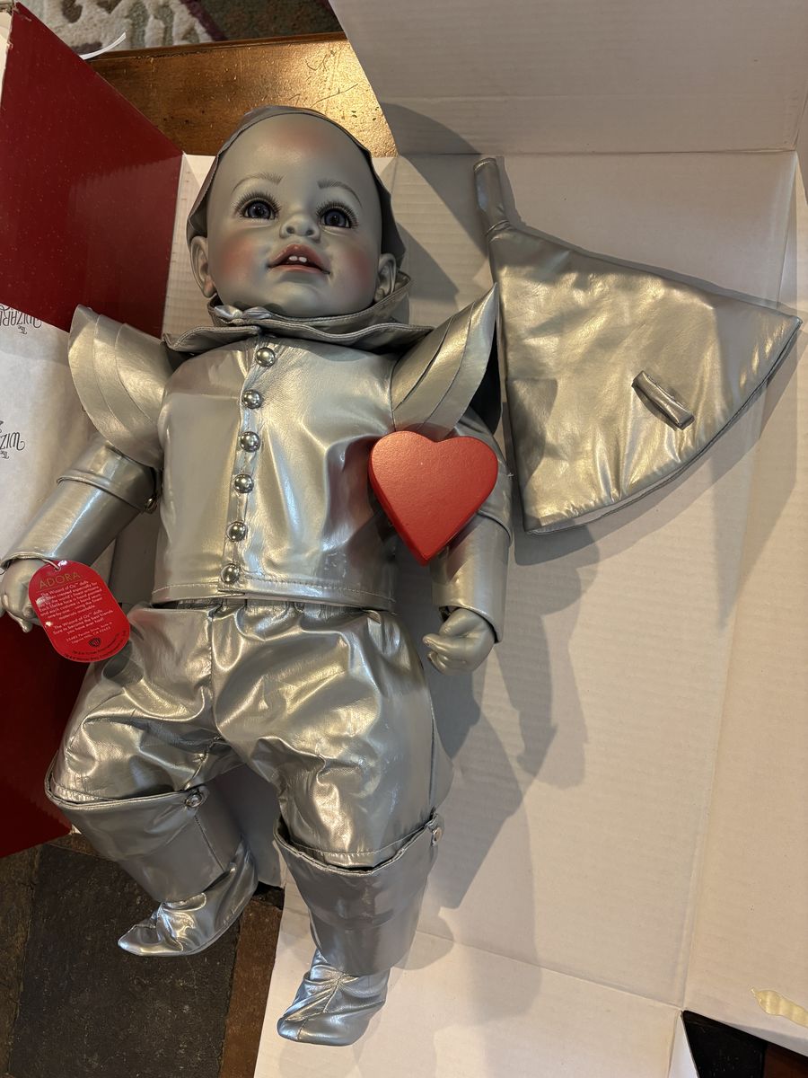 Venmo75th Anniversary Wizard of Oz Baby Doll by Adora (From 2013). Iconic Tin man costume, doll has lifelike features and a bean-bag weighted bottom for lifelike sitting. Adora doll is lightly scented with a fresh baby powder scent. Limited edition collection doll with authentic costume. 20" doll with endearing face and hand painted. Comes with original box, wooden heart, hat, toy axe, and certificate of authenticity.