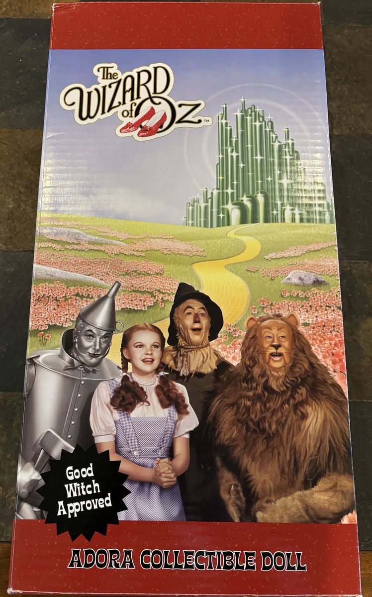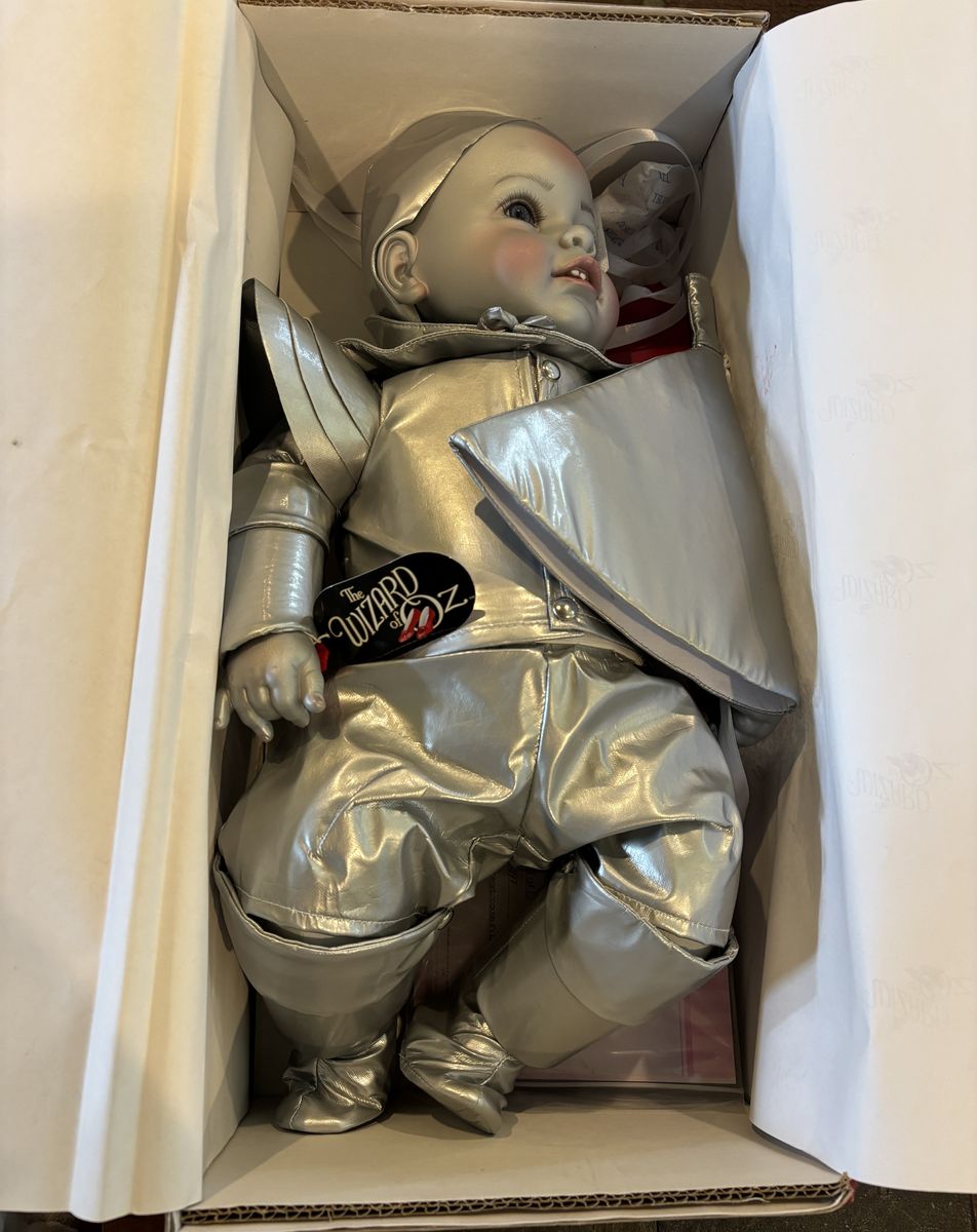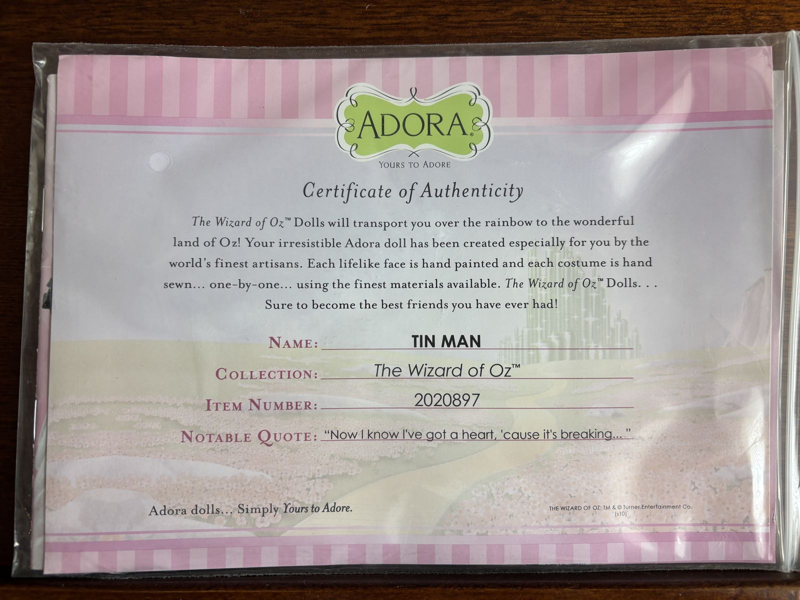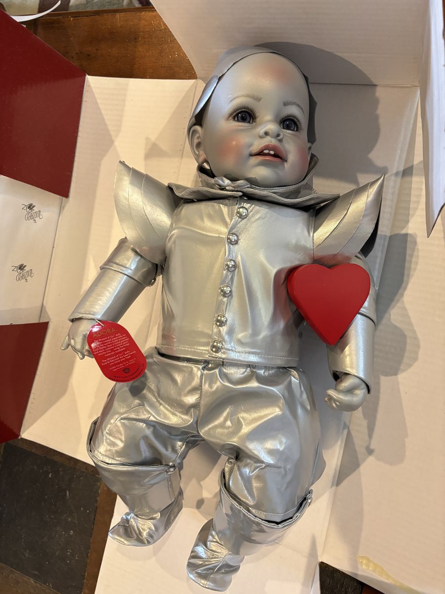 Venmo75th Anniversary Wizard of Oz Baby Doll by Adora (From 2013). Iconic Tin man costume, doll has lifelike features and a bean-bag weighted bottom for lifelike sitting. Adora doll is lightly scented with a fresh baby powder scent. Limited edition collection doll with authentic costume. 20" doll with endearing face and hand painted. Comes with original box, wooden heart, hat, toy axe, and certificate of authenticity.